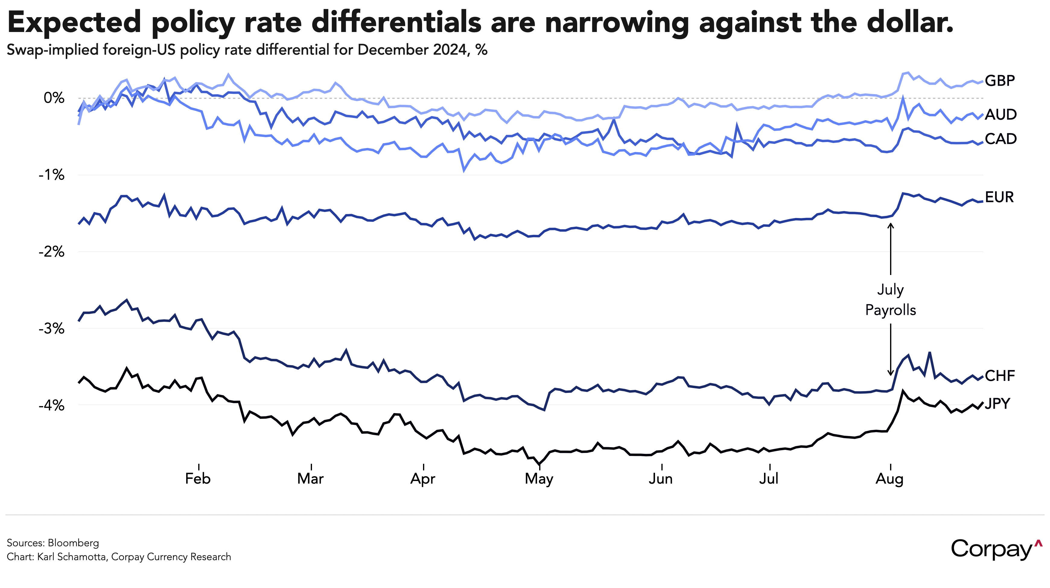 Markets expect the Fed to deliver a ‘shock and awe’ rate-cutting campaign against an economic backdrop distinctly lacking in either shock or awe. With the US economy seen achieving a soft landing while the Fed follows canonical policy guidelines – like the Taylor Rule* in cutting aggressively, expectations for year-end rates across the major economies have converged in the last month, reducing the dollar’s appeal from a yield perspective. Thus far, this has come without the offsetting force – the flight to safety – that typically ensues once the US economy begins slowing in earnest, but we can’t discount the possibility in the months ahead. As long as the Fed is cutting because it can, the dollar should depreciate in a gradual manner, but as soon as the Fed begins cutting because it has to, the dollar will rebound.