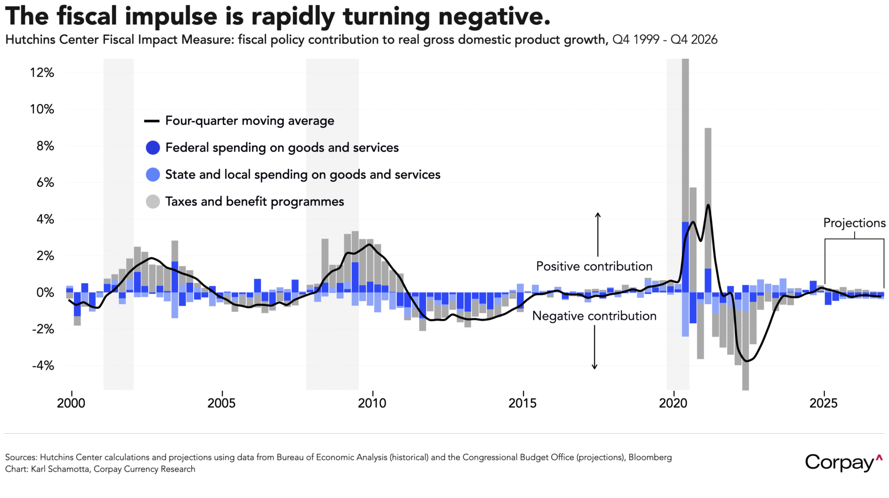 Tomorrow’s non-farm payrolls report could play a critical role in determining if the US exceptionalism trade can recover. Consensus estimates collected by the major data providers suggest 160,000 jobs were added in February as employment in many Southern states bounced back from winter storms in the prior month—but with uncertainty rising, and schools and government agencies facing funding freezes under the expiration of pandemic-era support programmes, a downside miss is quite possible. The chart below, which does not incorporate the impact of Donald Trump’s executive orders but does include the extension of the 2017 Tax Cuts and Jobs Act, shows the net impact of state and federal government spending and taxes on the economy turning negative in the first quarter, adding to the headwinds facing growth throughout 2025 and 2026.