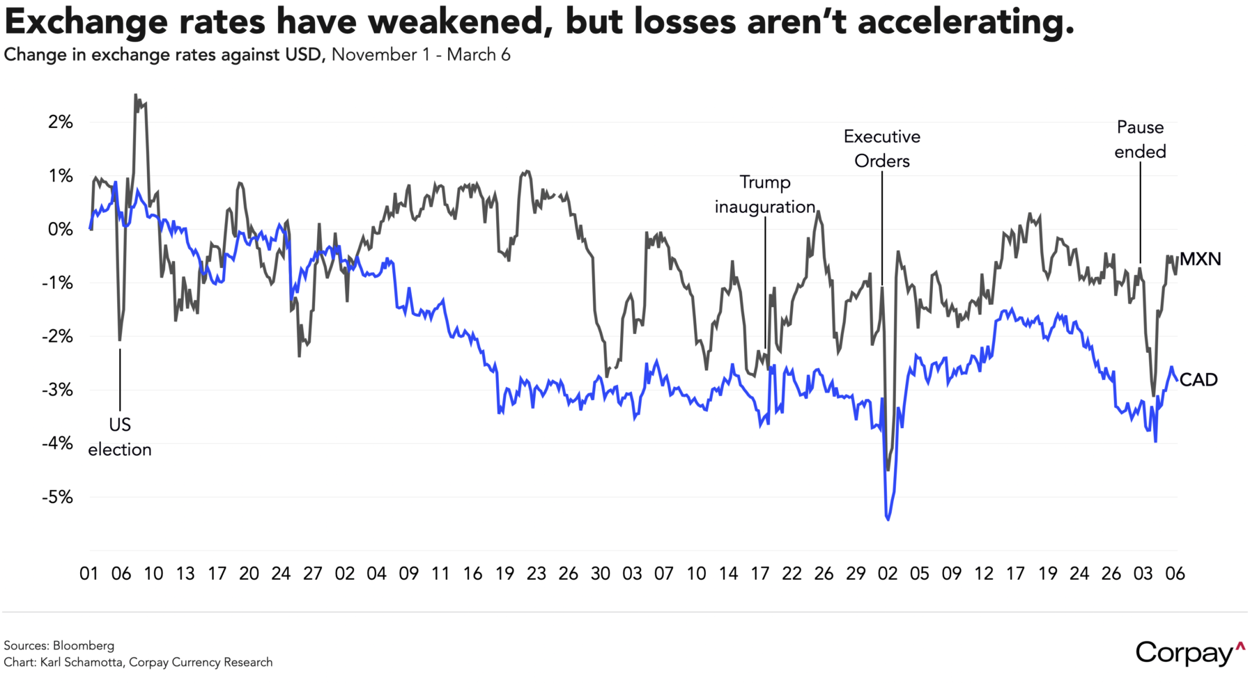 The Trump administration yesterday said it would give automakers a one-month reprieve from the 25 percent tariffs that have been imposed on other imports from Canada and Mexico. The pause—apparently a response to pressure from firms including Ford, GM, and Stellantis, but also the logical consequence of a poorly-thought-out approach to integrated supply chains—contributed to a mild easing in exchange rate pressures, but left overall uncertainty at elevated levels.