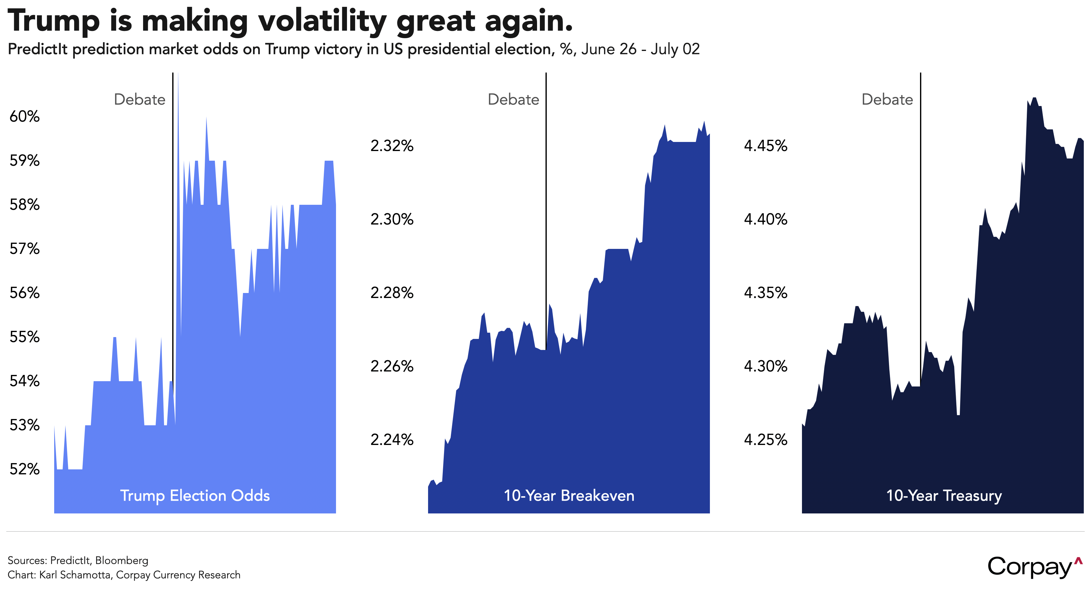 The dollar has risen sharply in line with a surge in Treasury yields over the last three sessions after a dismal performance from President Biden in Thursday’s televised debate triggered a dramatic reappraisal in the odds on a Republican sweep. With former president Trump cruising toward a second term and his party seen gaining control over both houses of Congress, markets think increased tariffs, reduced immigration, and lower taxes will lead to higher inflation, larger deficits, and more Treasury issuance. Breakeven inflation rates – a measure of expected price growth derived from the difference between inflation-protected securities and their nominal counterparts – have jumped since the debate, and Treasury yields are up more than 20 basis points.