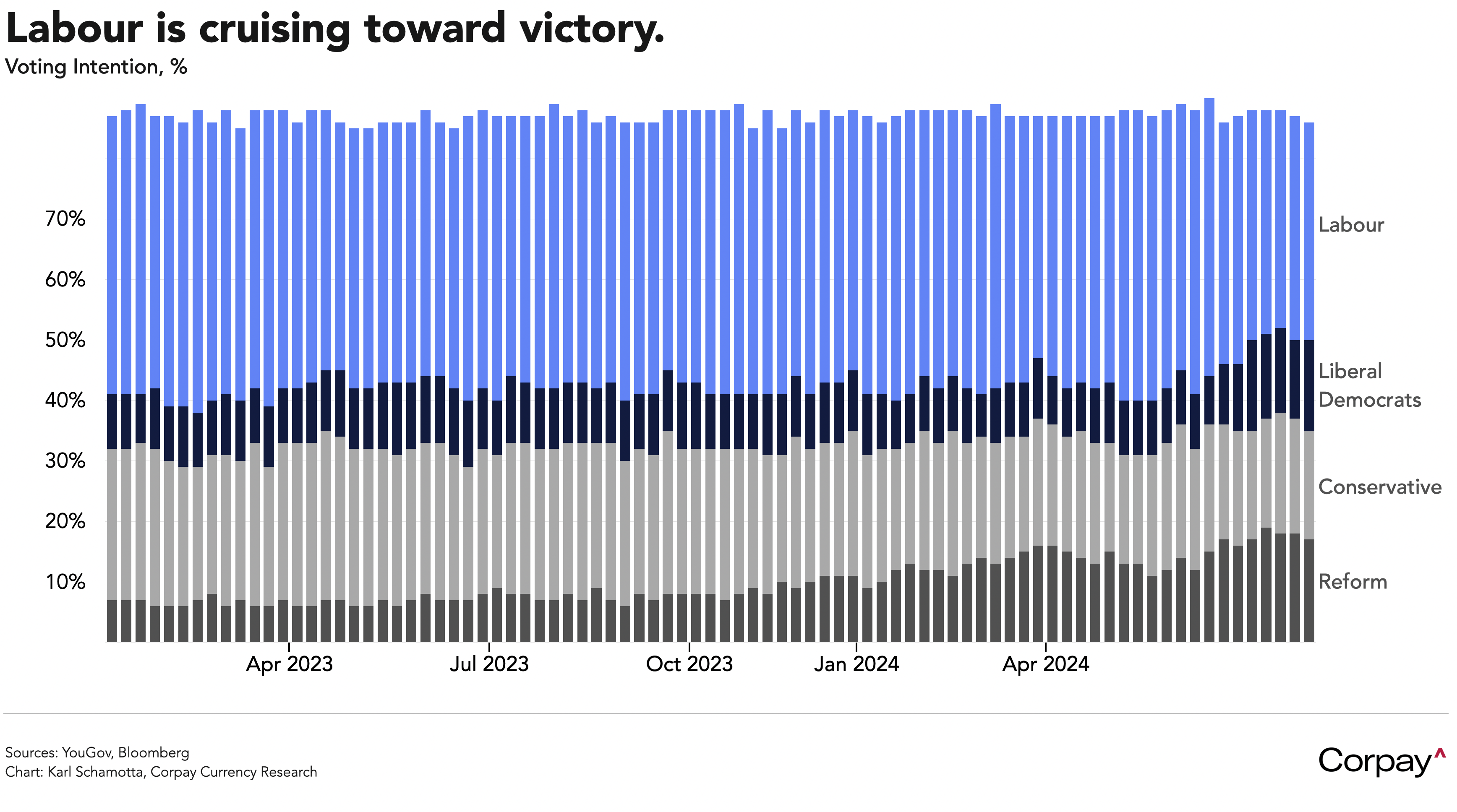 Britain’s pound is faring better, yet potential gains look limited. With Keir Starmer’s Labour party sitting on a 21-point lead over their rival Conservatives going into Thursday’s election, investors are looking forward to a reduction in post-Brexit tensions with the European Union and a shrinking in the risk premium that has been embedded in gilt yields since the ill-fated Truss administration’s experiment with fiscal policy. But government finances remain tight, meaning that the fiscal impulse is unlikely to turn terribly positive in the immediate term, and there’s little sign of the sort of wage- or demand-driven price pressures that could derail the Bank of England’s easing plans in the months ahead. Data out this morning showed retail consumer inflation falling to a 32-month low, pushing the odds on an August rate cut above the 50-percent threshold.