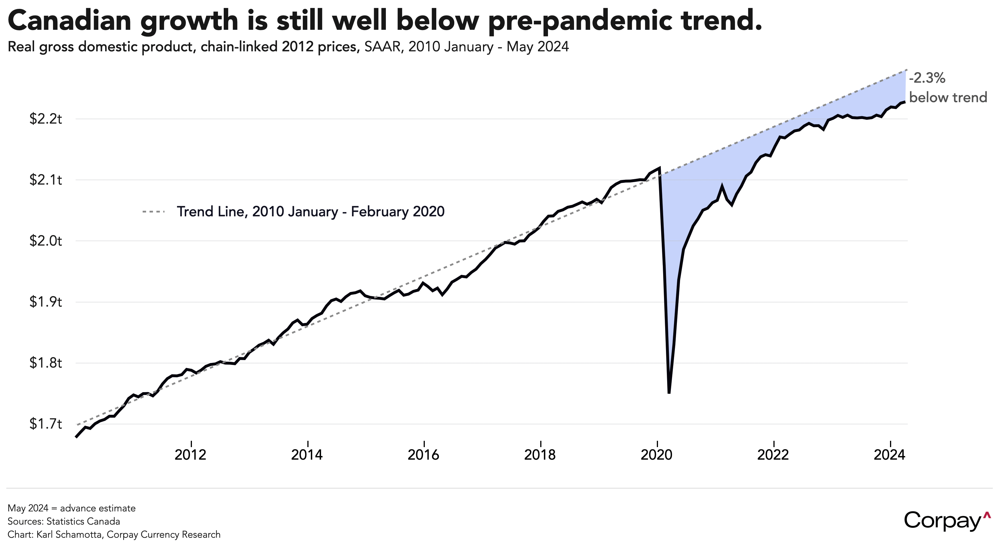 And here in Canada, where much of the country is still sleeping off yesterday’s festivities, there isn’t much to celebrate on the growth front. After having entered the post-pandemic monetary tightening cycle with vastly higher rate sensitivities – due to higher debt burdens and shorter-term mortgages – than their American counterparts, Canadian households are struggling to power the economy, and growth remains well below trend. With Friday’s advance estimate for May gross domestic product growth in hand, it looks as if the Canadian economy remains 2.3 percent smaller than the pre-pandemic course would suggest, amounting to almost $298 billion dollars (2012 terms) in lost output. The bull case for the loonie remains seriously challenged.