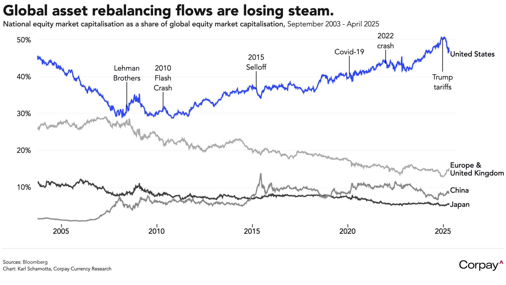 Risk appetite is returning to global financial markets this morning as investors move to price in rate cuts and traders welcome a more conciliatory tone from the Trump administration on trade and monetary independence issues. The president and Treasury Secretary Scott Bessent both made supportive noises on trade negotiations during yesterday’s session, and a number of Federal Reserve officials highlighted downside risks in public appearances. North American stock market futures are setting up for a modestly-lower open, but the US ten-year Treasury yield is pushing lower, and the dollar is strengthening against its safe-haven alternatives in Japan, Switzerland, and the euro zone. Signs of a fundamental trend reversal remain difficult to see, but the rotation out of US equity markets appears to be stabilising.