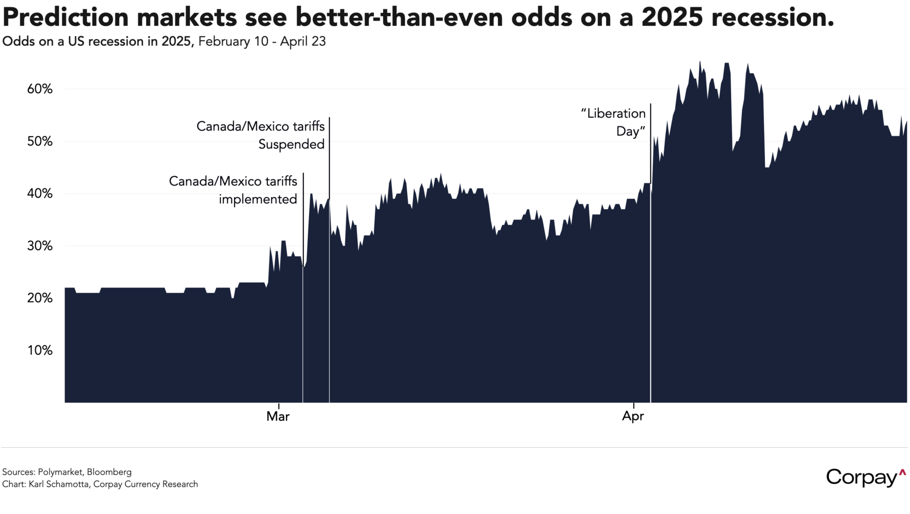 Investors are on the fence. Prediction-market odds on a recession in the world’s largest economy have surged in the last two months, but are still just above coin-toss levels, indicating a heightened degree of uncertainty about how the administration’s incredibly-erratic policy changes might influence activity in the real world. Swap-implied probabilities are tilted toward three rate cuts from the Fed before year end – consistent with a move toward “neutral,” but not reflective of the sort of emergency easing cycle that has historically accompanied economic downturns.