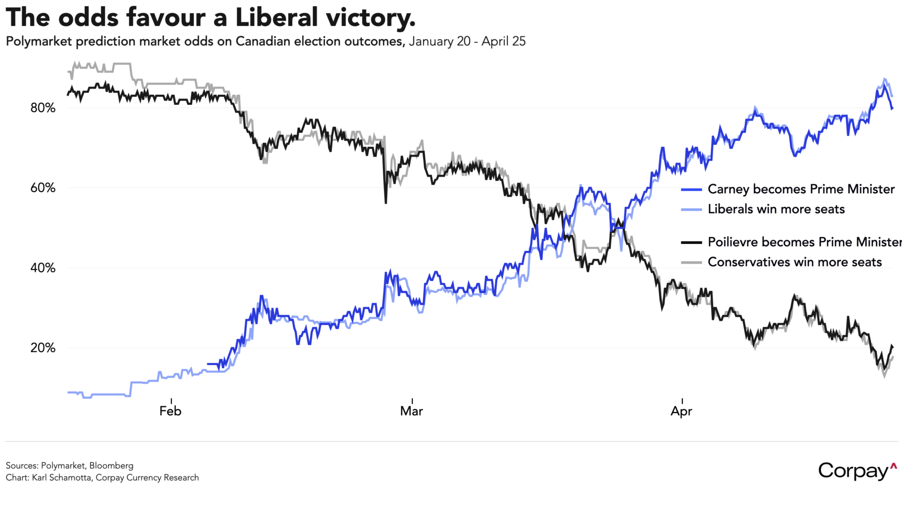 Relative to other major currencies, implied volatility in the dollar-Canada pair looks well-contained ahead of Monday’s election. Mark Carney’s Liberals are the clear front-runners in a race that has turned into a referendum on Canada’s relationship with the United States, but investors are unlikely to react with hostility if Pierre Poilievre’s Conservatives – who have promised larger tax cuts and more deregulation – somehow emerge victorious. Although investors tend to react with revulsion to the sort of spending plans the Liberals are now outlining, the reality is that many would welcome an offset to the other near-term headwinds facing the Canadian economy – rising joblessness, slowing export growth, and weak investment coming on top of terrible productivity and still-spectacular levels of household indebtedness – and we don’t expect major moves in bond markets after the outcome is pronounced next week.