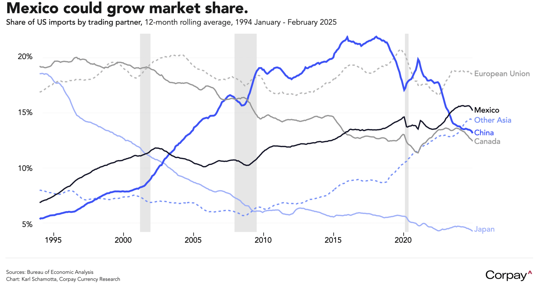 Further south, the Mexican peso is also exhibiting remarkable stability. The exchange rate has risen sharply in the last month as the dollar has weakened, and on signs that President Claudia Sheinbaum’s diplomatic efforts are paying off, helping insulate the economy from the effects of Donald Trump’s trade war. Carveouts for Mexican goods have reduced the effective tariff rate to levels that make the country competitive with its counterparts in Asia — suggesting that it could increase its market share in the American import basket, and that existing investment is unlikely to leave.