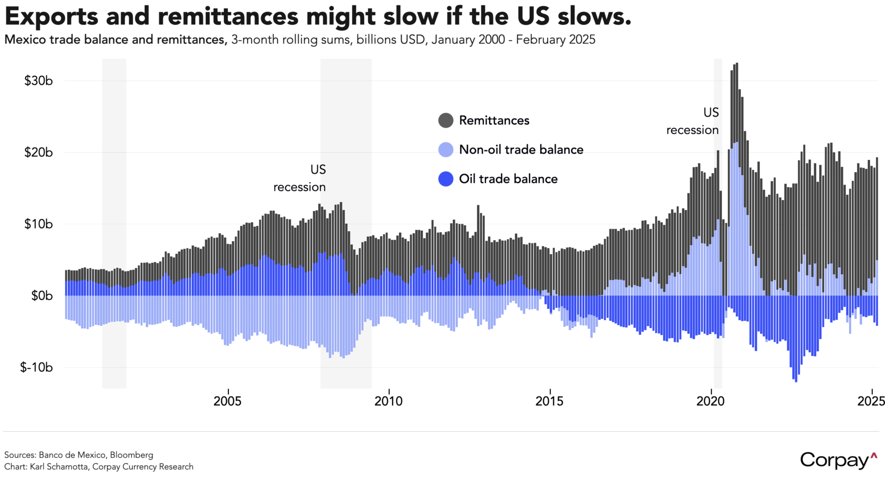 But in the medium term, ties to an increasingly-beleaguered American economy could drag the exchange rate lower. With domestic demand already weakening, and exports and remittances exposed to a slowdown in activity north of the Rio Grande, the country’s growth rate looks set to slow – especially once first-quarter tariff front-running effects begin to fade. The Banxico is already hinting at more 50 basis-point cuts to come, which would narrow rate differentials relative to the US, particularly if high inflation expectations slow the Fed’s easing progress. We wouldn’t rule out a drift back through the 20 threshold for the Mexico-dollar pair at some point in the coming months.