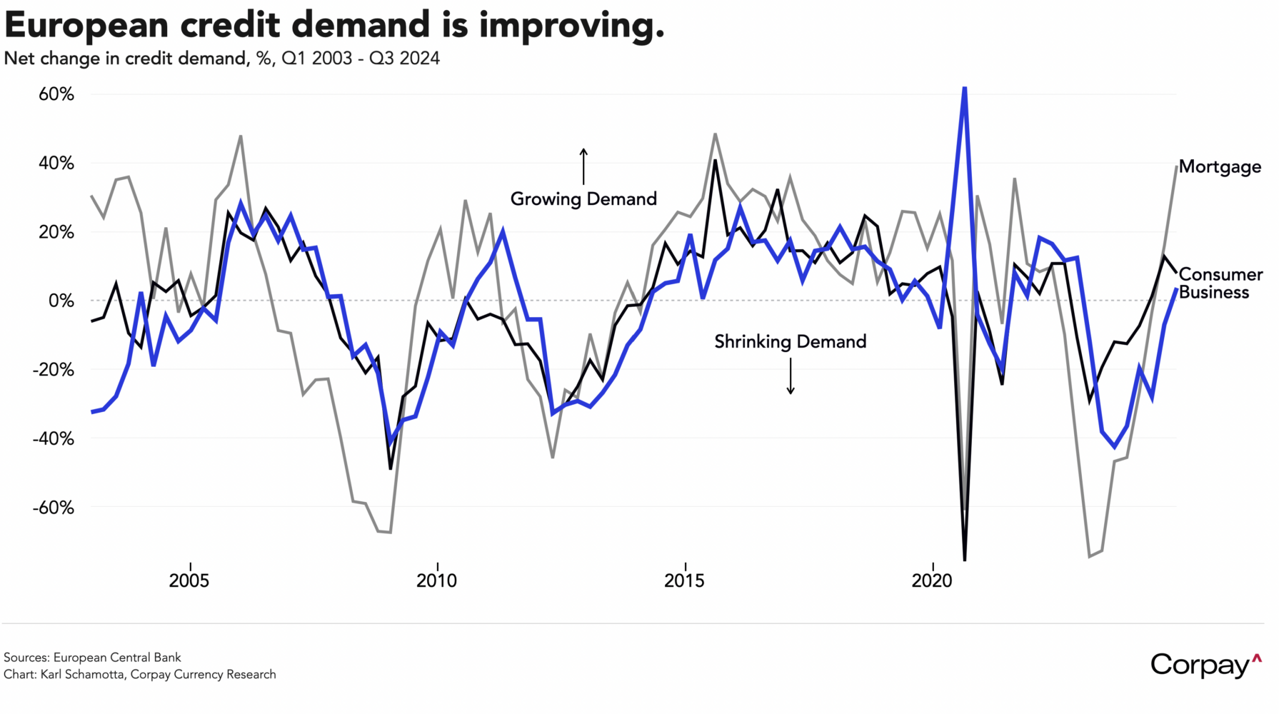 The euro is regaining its footing after demand for credit climbed in the common currency area for the first time in more than two years, suggesting that the European Central Bank’s monetary easing efforts are helping drive an improvement in financial conditions. Policymakers are widely expected to respond to clear evidence of disinflationary pressures and signs of widespread economic weakness with a third consecutive rate cut at Thursday’s policy meeting, further widening the differential with US rates.