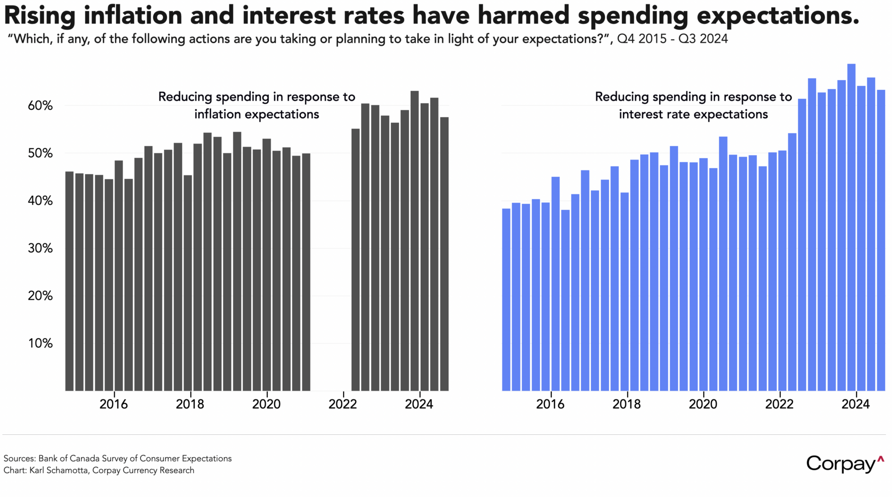 The Canadian dollar is trading sideways in the run-up to the release of September’s inflation data at 8:30. Economists suspect that headline prices fell -0.2 percent on a month-over-month basis, with a big drop in gasoline prices contributing the bulk of the decline. The Bank’s preferred core measures are more difficult to forecast, but we doubt they will provide sufficient motivation to deliver an outsized rate cut at next week’s meeting. Survey data last week showed business and household sentiment staying subdued in the third quarter, but home price expectations remained robust and consumers grew slightly less concerned about the impact that high inflation and rising interest rates might have on their spending plans – suggesting that consumption growth could stabilise near current levels.