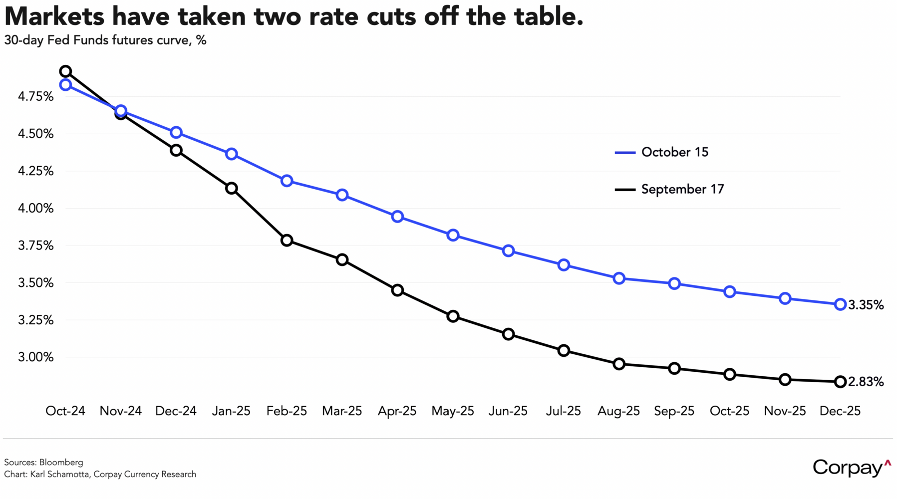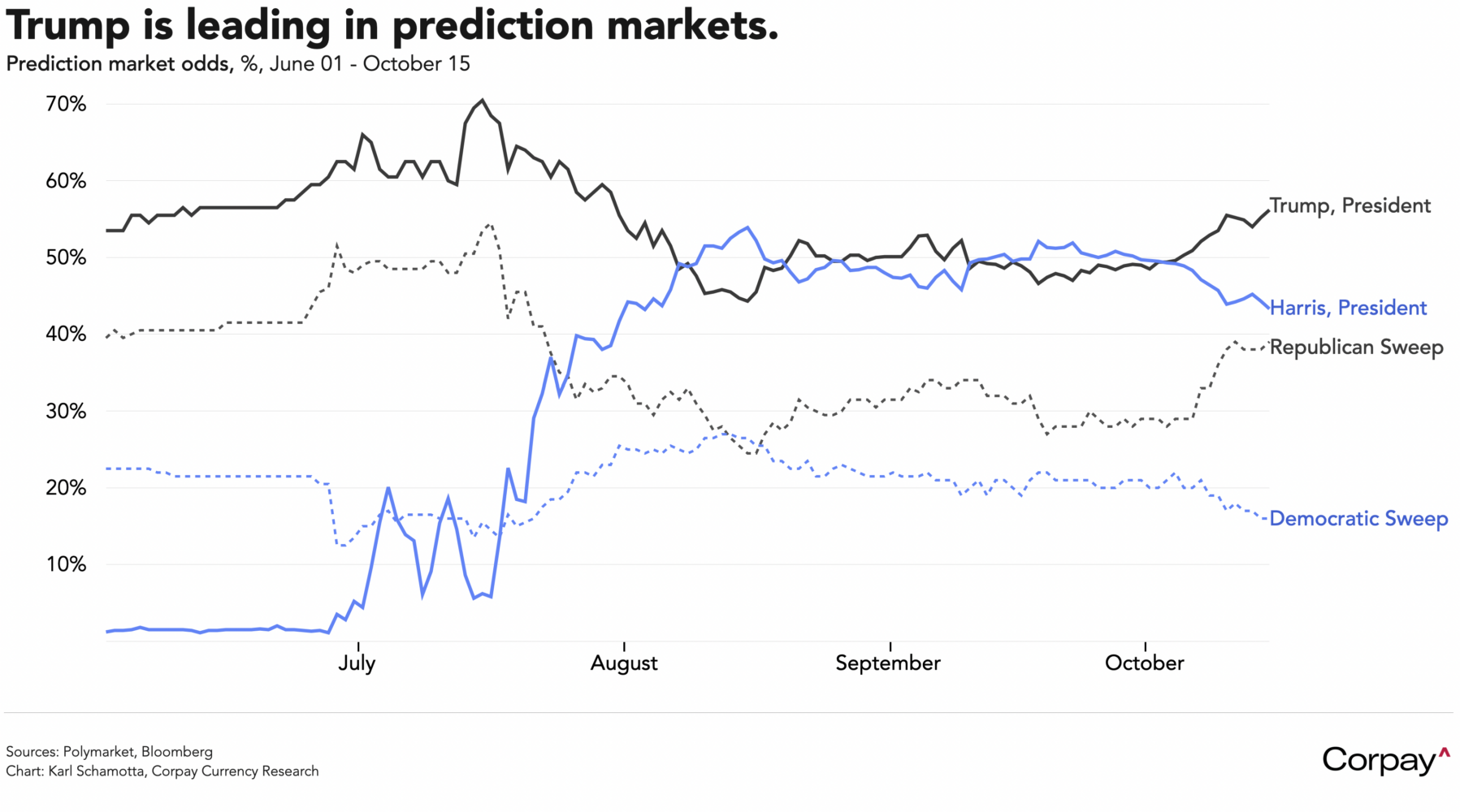 The “Trump trade” is generally understood to be playing a role in foreign exchange markets, with investors seen buying the dollar on dips as they seek to front-run an increase in inflation, interest rate, and volatility expectations. Although Kamala Harris has maintained a slight edge in recent polls, prediction markets have tilted dramatically in Donald Trump’s favour over the last week, and the odds of a Republican sweep have risen sharply, theoretically raising the need for dollar liquidity – but we’re still struggling to find clear evidence of a politically-driven bid for the greenback, beyond the typical pre-election hedging surge.