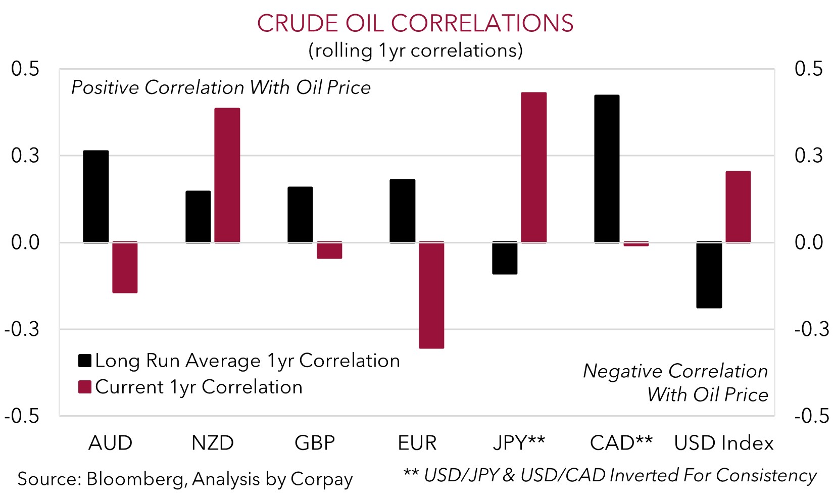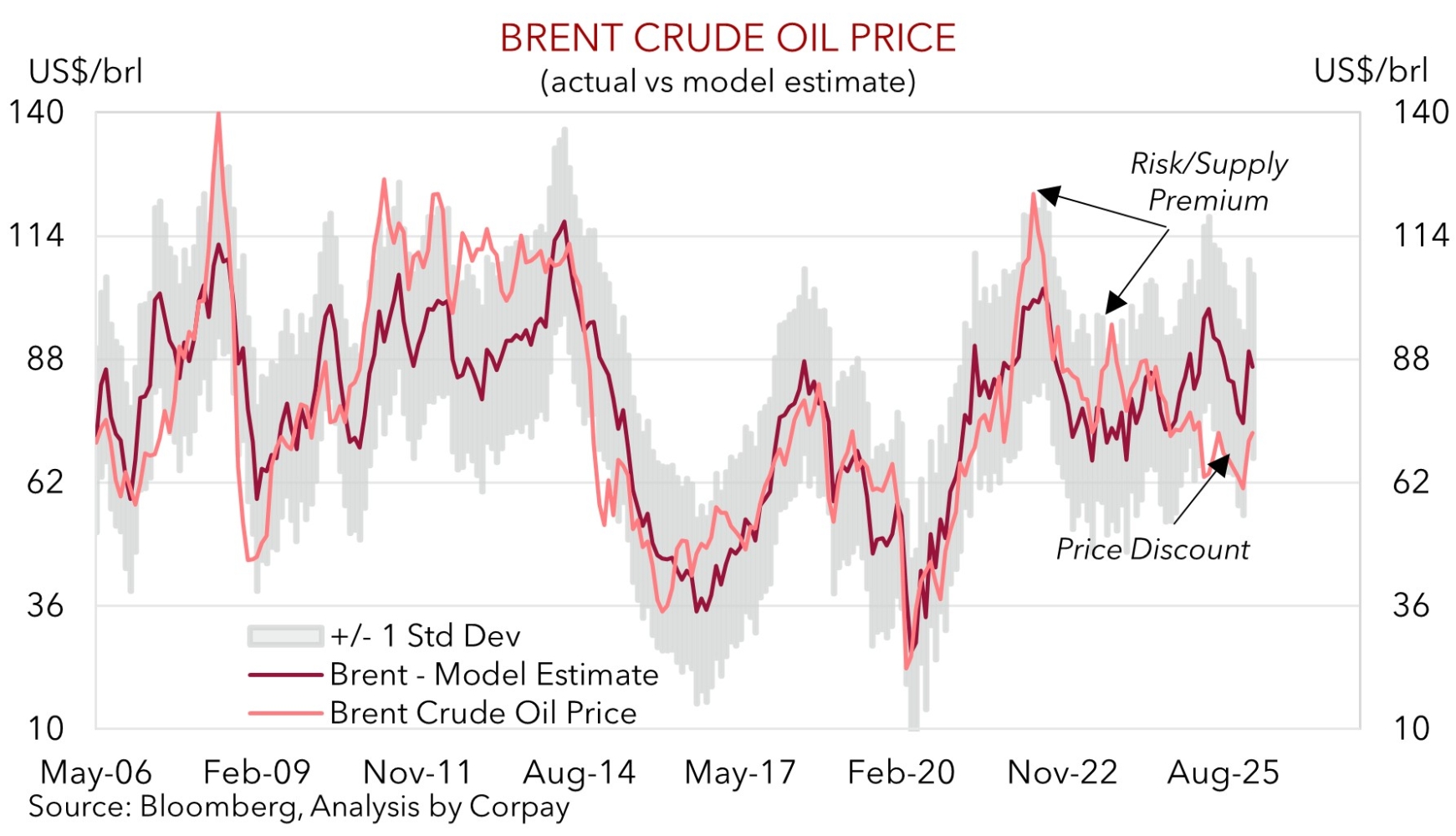 Iran’s Foreign Minister has indicated there is no intention to close the Strait of Hormuz, however trade flows will still be disrupted. In our opinion, a repricing of the risks given the range of possible outcomes, could see the demand/supply mix in global energy markets adjust, pointing to oil prices moving up to at least where fundamentals imply they should be. Our models indicate Brent Crude oil has scope to rise ~10-15% (see chart below). In FX, along with traditional safe-haven demand, this should be USD supportive given the US’ standing as a ‘net energy exporter’ and the USD’s positive correlation to oil prices.