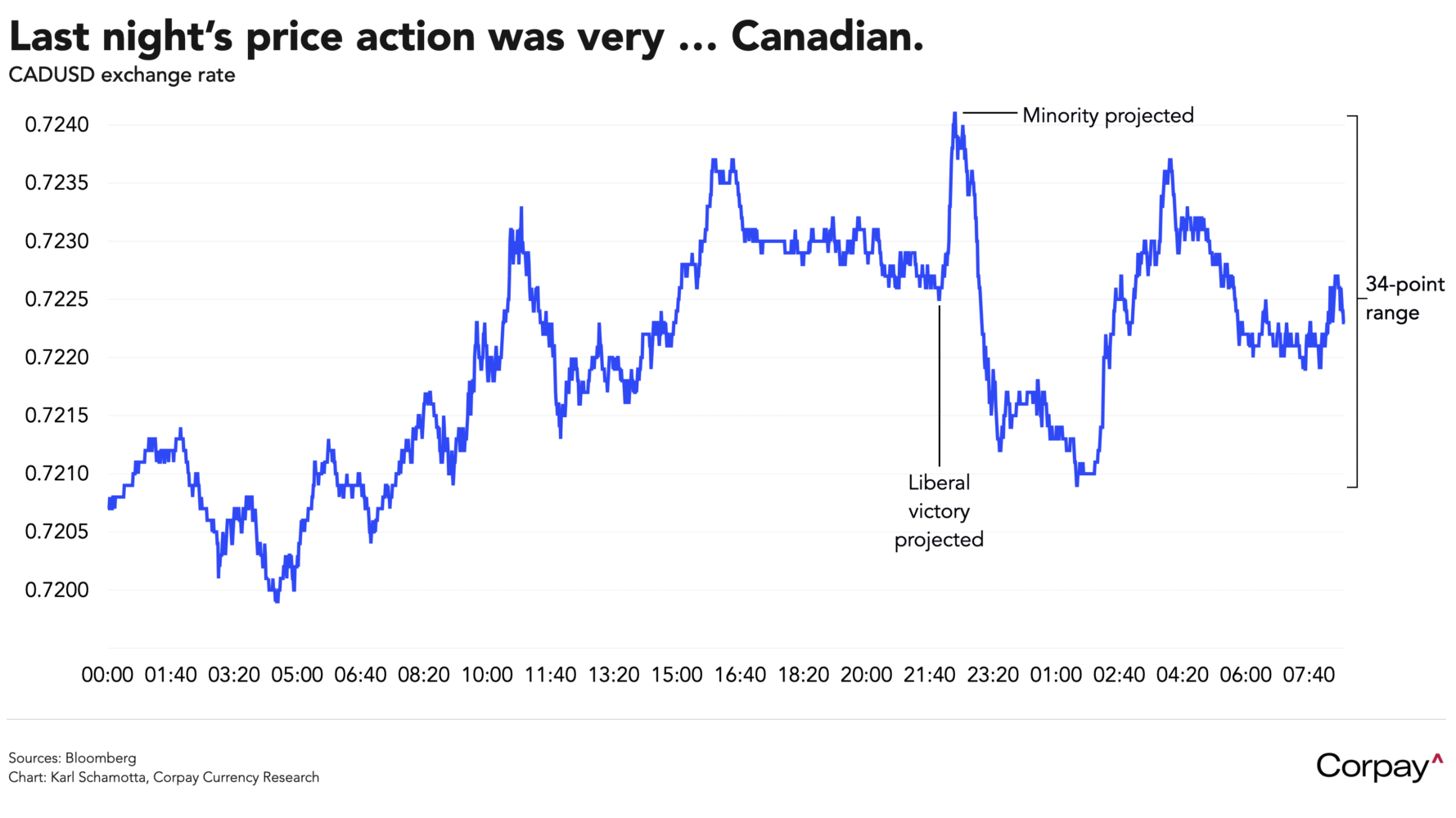 The Canadian dollar is modestly lower after Mark Carney’s Liberal Party achieved a thinner-than-expected margin of victory in yesterday’s close-fought Canadian election, driving whiplash price action within an incredibly-tight trading range.
