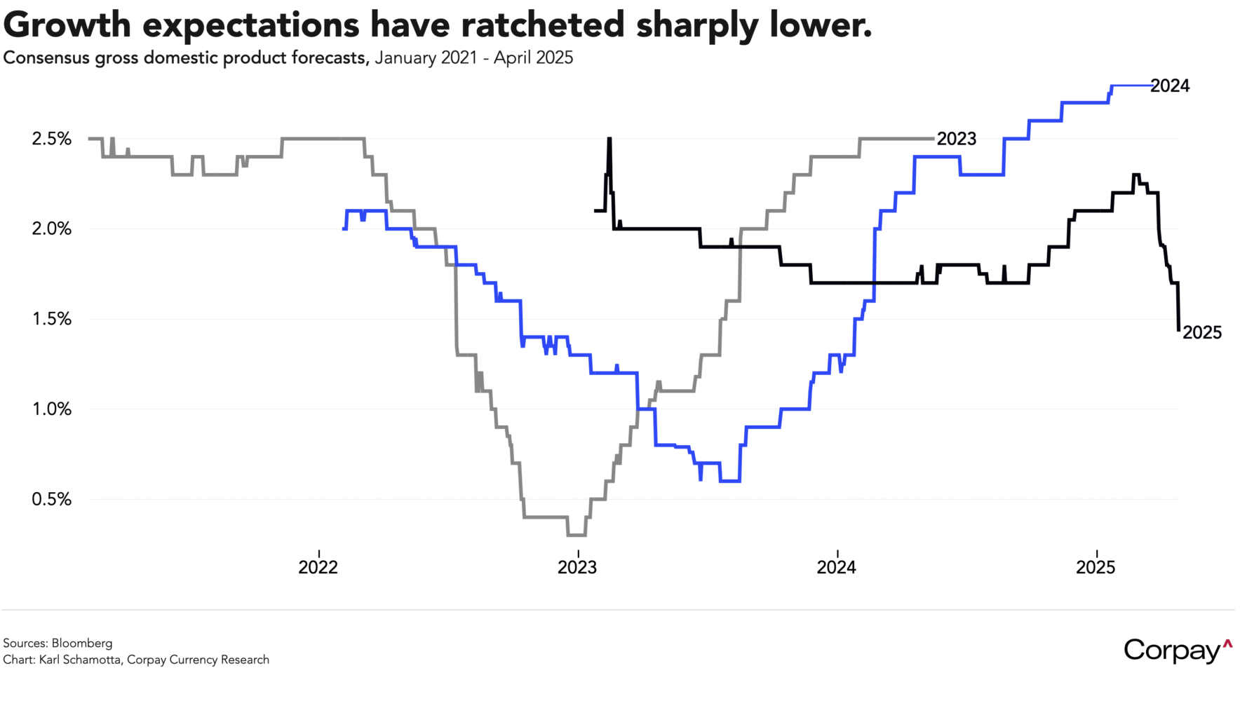 Ahead today, two major US data releases could add to the confusion surrounding prevailing economic conditions. The closely-watched Job Openings and Labor Turnover report is expected to show the layoff rate staying low and vacancies continuing to edge down, suggesting that labour markets remained relatively healthy in March. The Conference Board’s April consumer confidence report, in contrast, is likely to exhibit serious trade war scarring, with households reporting a sharp erosion in views on the future. Policy uncertainty soared during the survey period, and could be reflected in a greater-than-4-point drop in the headline print from the prior month’s 92.9 level. Overall growth expectations for 2025 have fallen dramatically in the last two months.