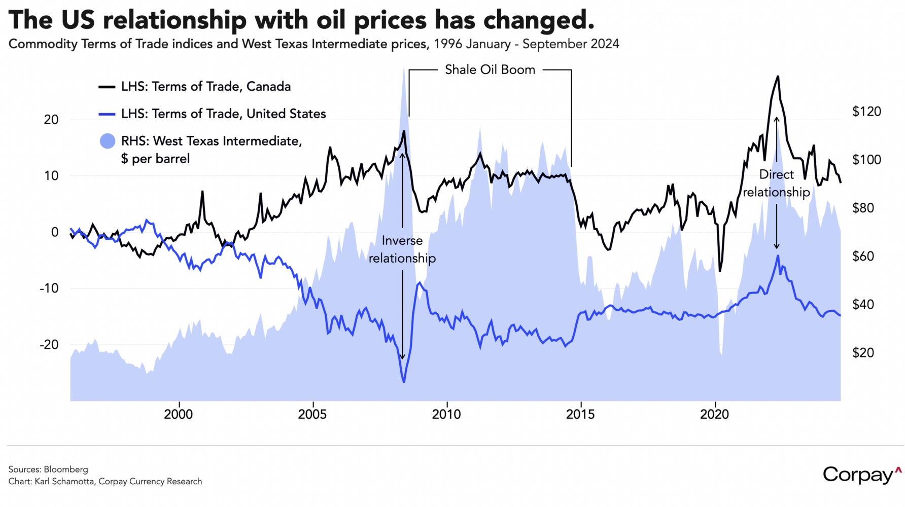 The United States’ reemergence as a global energy superpower has changed how currency markets react to fluctuations in crude prices. The shale oil revolution – the massive boom in unconventional oil production that began in the late aughts – has turned the US into a net oil exporter, substantially reducing economic vulnerabilities to rising prices. The country’s commodity terms of trade – the ratio of the average price of raw material exports to the average price of imports – exhibited a negative relationship with oil prices from the 1960’s through to the early 2010’s, but now tends to improve when prices rise. The dollar is now somewhat insulated against price shocks – in both directions – and no longer plays the foil to oil exporter currencies like the Canadian dollar.