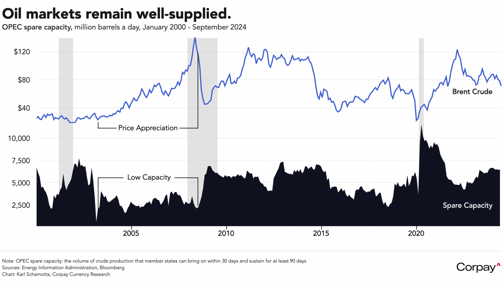 We’re not sure Saudi Arabia really had a $100 target, but prices have come under sustained pressure this year against a deteriorating demand backdrop and a high level of spare capacity among cartel members. The country’s fiscal deficit has widened even as evidence of an offsetting negative supply response from non-OPEC producers has been difficult to see.