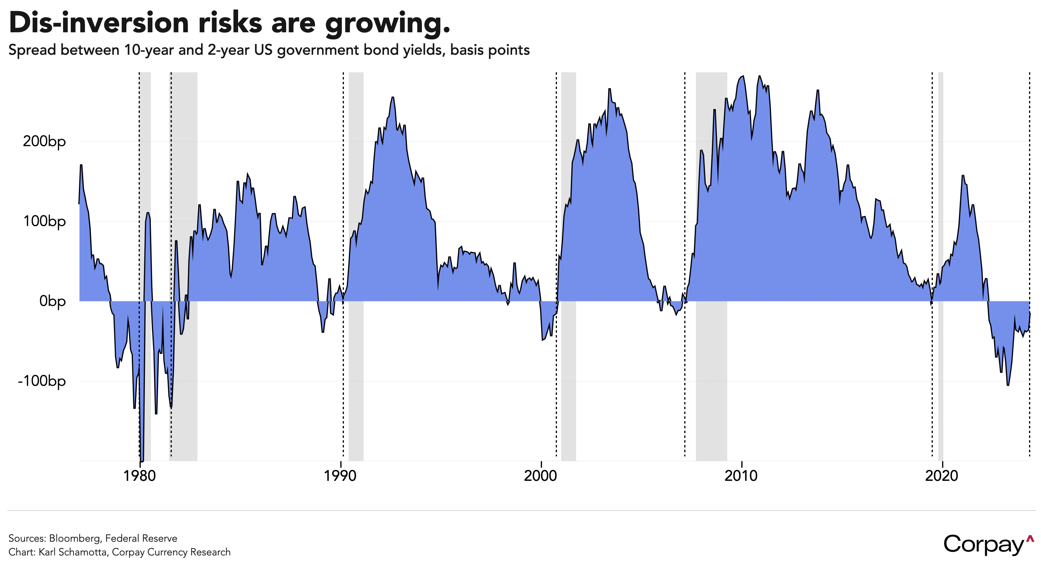The US yield curve is moving close to dis-inversion, with the difference between ten- and two-year bond yields – which has been negative for the better part of two years – suddenly moving toward positive territory. Short rates are declining as investors grow more confident the Federal Reserve will begin an aggressive easing cycle in September, and long rates are climbing as the prospect of a second Trump administration brings the impact of tighter immigration restrictions, higher tariffs, and greater fiscal expansionism into closer focus. This is raising market fears of an imminent economic downturn, given that the curve has inverted – and then dis-inverted – before all but one of the nine recessions since 1955*.