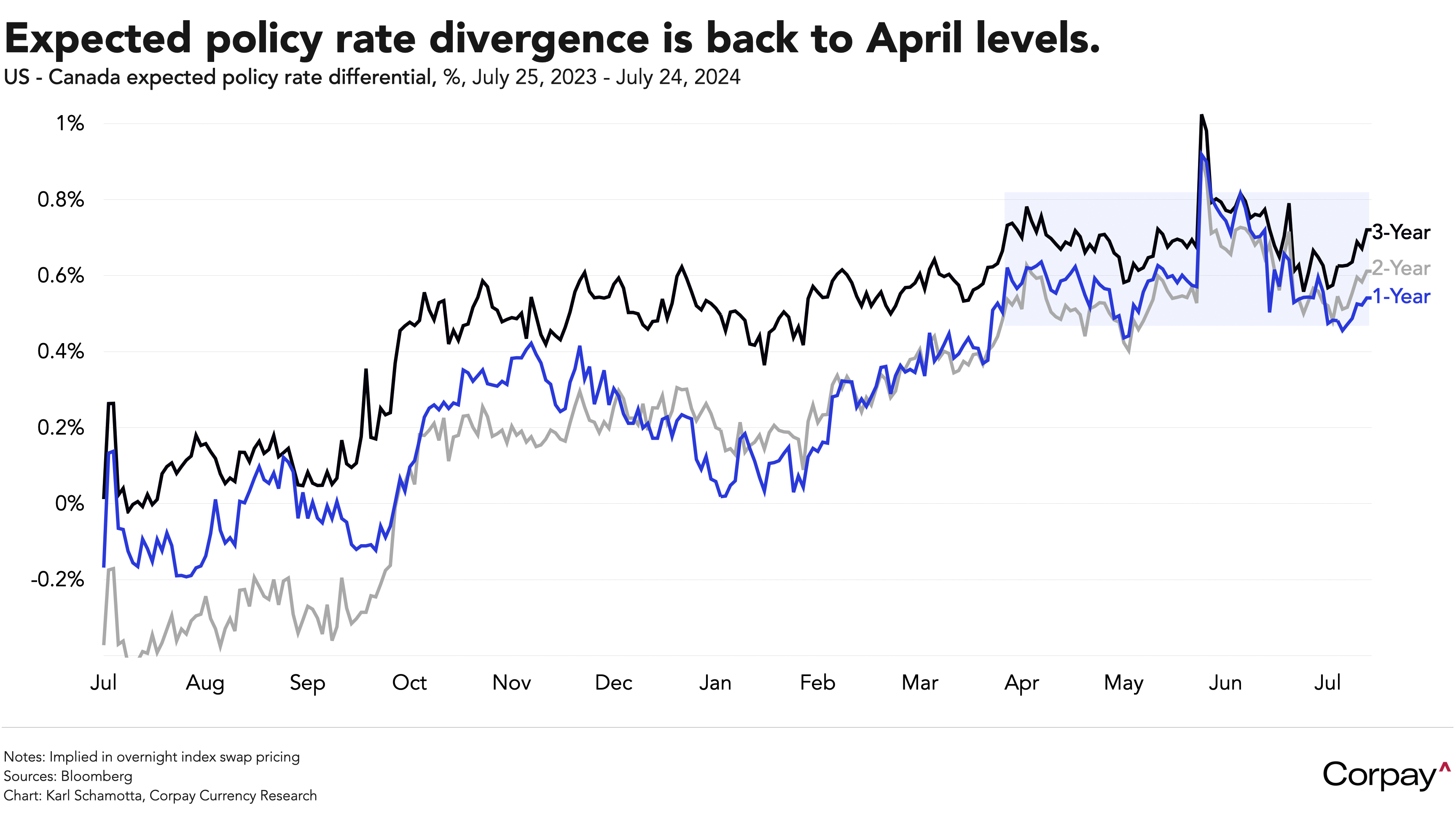 Echoing our own views, officials downplayed risks associated with a potential widening in policy rates relative to the Fed’s settings. Macklem said “With inflation showing more signs of easing in the United States, my sense is that divergence is not going to be particularly serious”. Markets agree: policy rate differentials – which derive expectations for the Fed’s policy rate and the Bank of Canada’s from overnight index swap prices – are holding stable across one, two, and three year time horizons at levels that have essentially prevailed since early April.