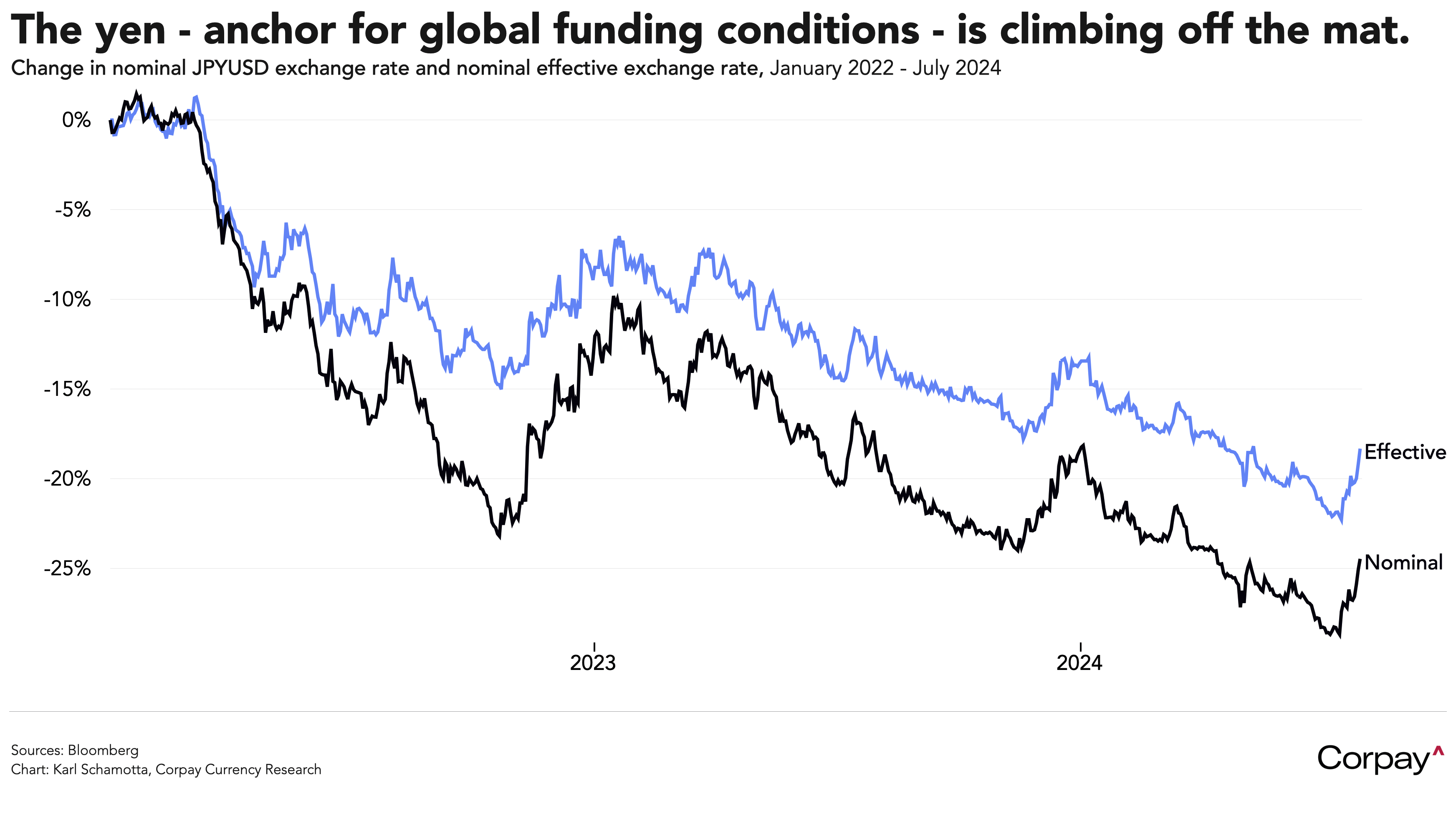 The cost of borrowing in Japanese yen is rising. After a series of official intervention efforts, a slowing in US inflation, and a big jump in bets on rate hikes from the Bank of Japan, the exchange rate is making a serious attempt at breaking out of its long-term decline. Carry trades funded in yen are growing more expensive, and domestic investors now have an incentive to deploy money at home instead of in hedged dollar-denominated vehicles. An anchor for global capital flows is slowly being lifted, taking the air out of emerging market currencies, US technology stocks, and long-term Treasury markets.