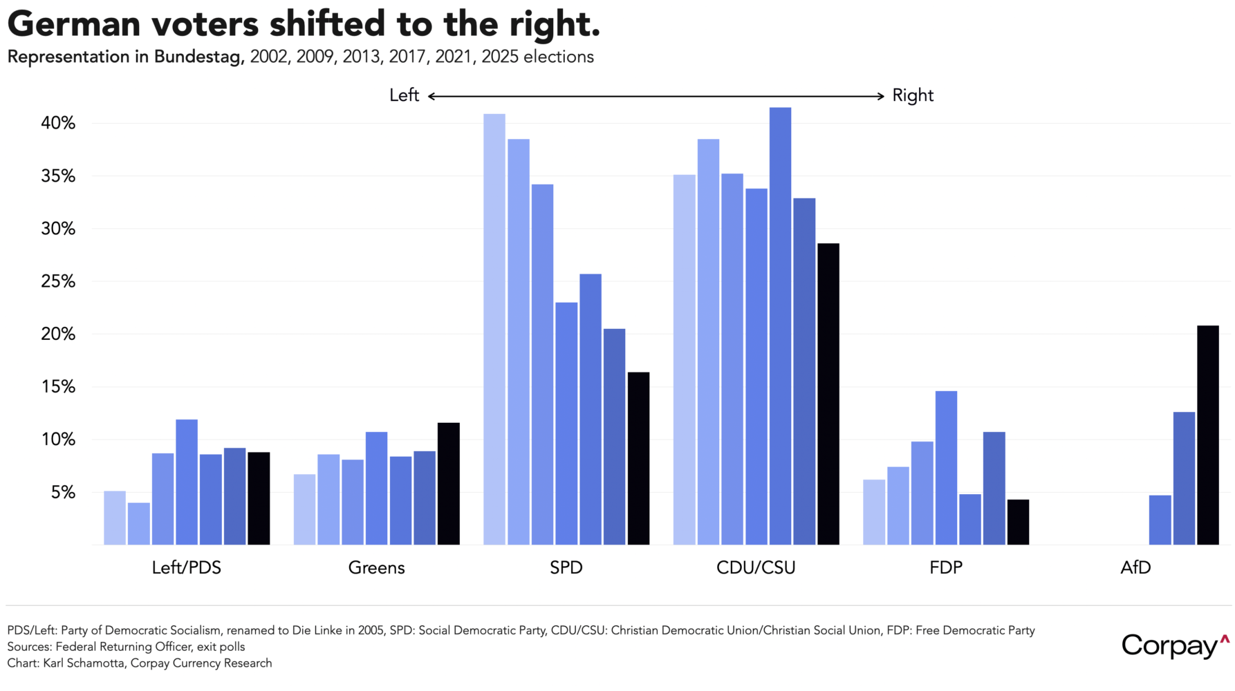 The euro is trading with a supportive bias after a centre-right party emerged victorious in Germany’s federal election, avoiding a lurch into extremist territory and paving the way for business-friendly economic reforms. The Christian Democrats led by Friedrich Merz are believed to have won 28.5 percent of the vote against the far-right Alternative for Germany’s 20.8 percent, 16.4 percent for the centre-left Social Democrats, 11.6 percent for the Greens, and 8.8 percent for The Left. The government could find it difficult to enact broad-reaching defence and fiscal policy changes—given that parties on the extreme left and right have enough votes to form a “blocking minority” in the Bundestag—yet Merz is nonetheless now expected to work with the Social Democrats to form a governing coalition focused on reducing taxes, loosening red tape, and providing more support to the military.