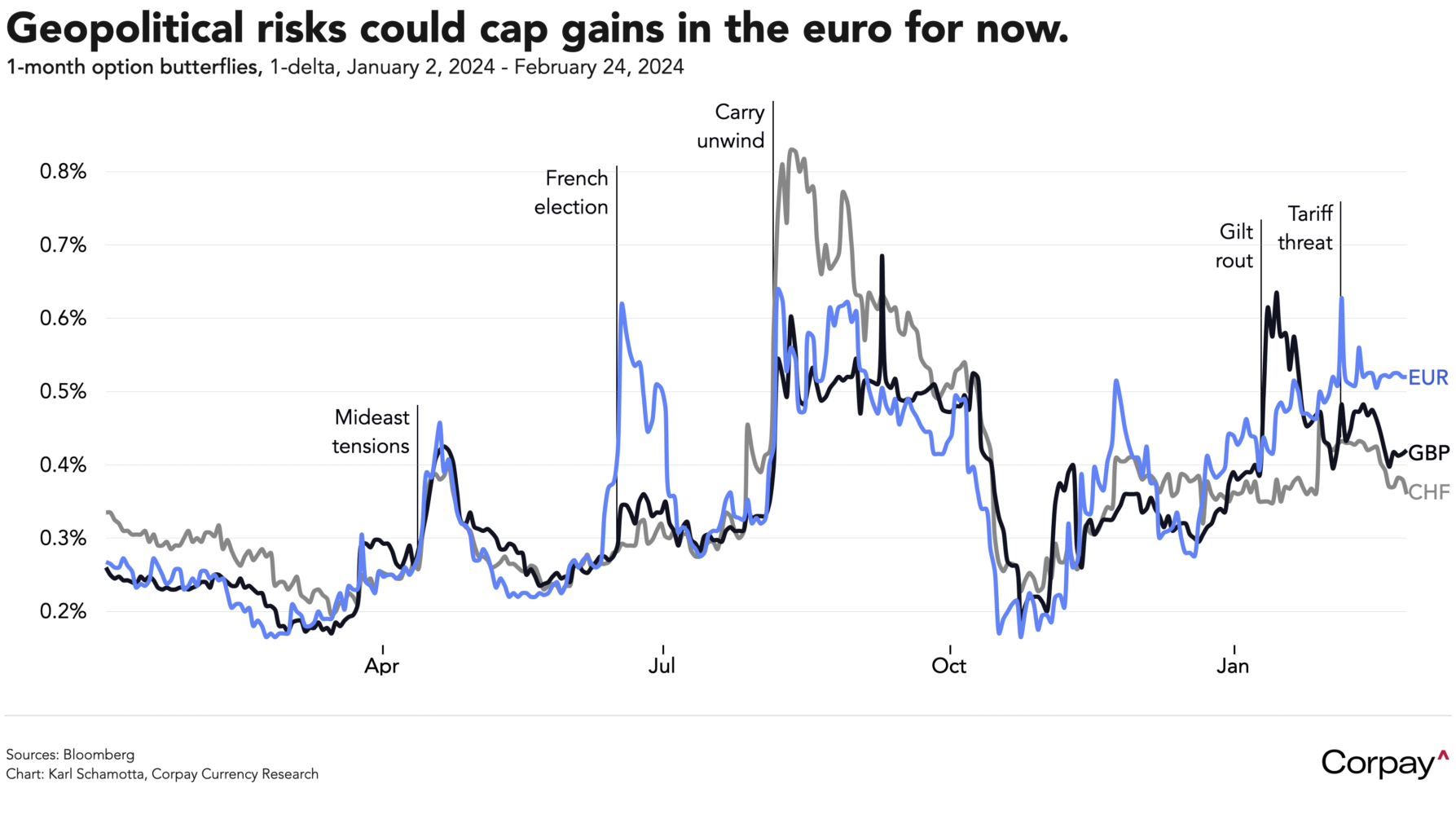 Trans-Atlantic relations could be set for more turbulence. President Trump welcomed Merz’s victory*, saying that it showed Germans—like their American counterparts—had turned against the “no common sense agenda, especially on energy and immigration”. But trade frictions remain, and within hours of polls closing, the incoming chancellor acknowledged a radical shift in foreign policy, saying that he would seek to “strengthen Europe as quickly as possible, so that we achieve independence from the US, step by step… I never thought that I would ever need to say something like that, on television, but after the latest statements made by Donald Trump last week, it is clear, that the Americans—at any case these Americans, this administration—mostly don’t care about the fate of Europe one way or another”. Trump last week appeared to accuse Kyiv of starting the war in Ukraine, and his administration has pivoted toward supporting Russia at a speed that has astonished even hardened foreign policy observers. Option butterflies, which measure demand for hedges against extreme exchange rate moves, suggest that the weekend’s election hasn’t materially lowered perceived geopolitical risks in the euro area, meaning that the currency’s gains could remain capped for now.