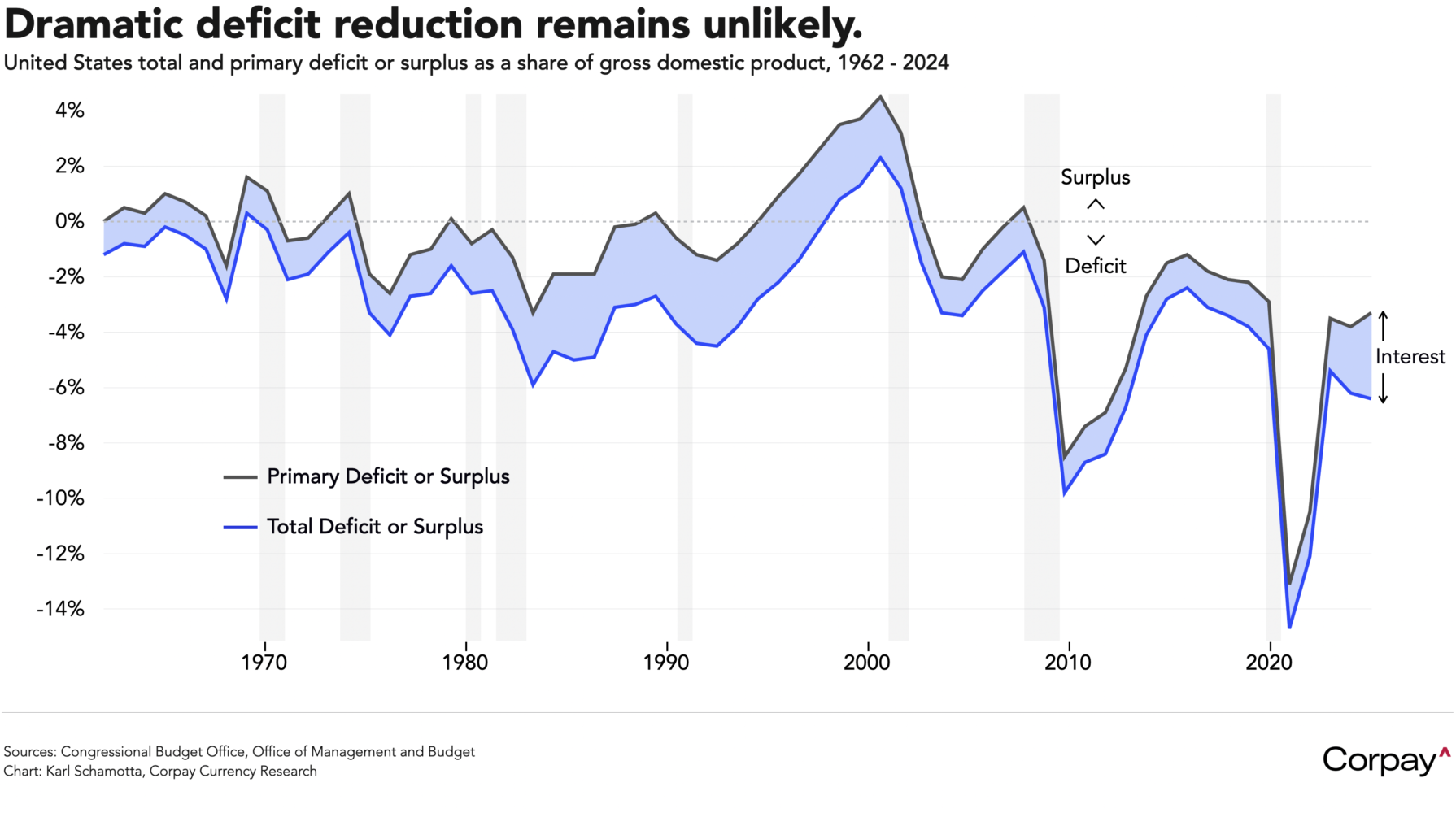 Beyond the hard numbers, investors will be watching for news on the tariff front—Trump’s postponement of levies on Canada and Mexico is set to expire on March 4—and keeping a wary eye on movement toward a government funding deal ahead of the March 14 debt ceiling deadline. Republicans in the Senate and House are working on rival measures to extend tax cuts, tighten border security, and increase military spending, but a small number of budget hawks remain opposed to plans that would substantially increase budget imbalances over the next decade, and haven’t been satisfied by the Department of Government Efficiency’s noisy but relatively-trivial cost-cutting efforts thus far. Markets would welcome the successful passage of a funding bill, but without major cuts to defence and entitlement programmes, the US government deficit appears likely to remain the biggest in the world for many years to come – meaning that investors may have to keep swallowing outsized issuance volumes, keeping interest expenses near record levels.