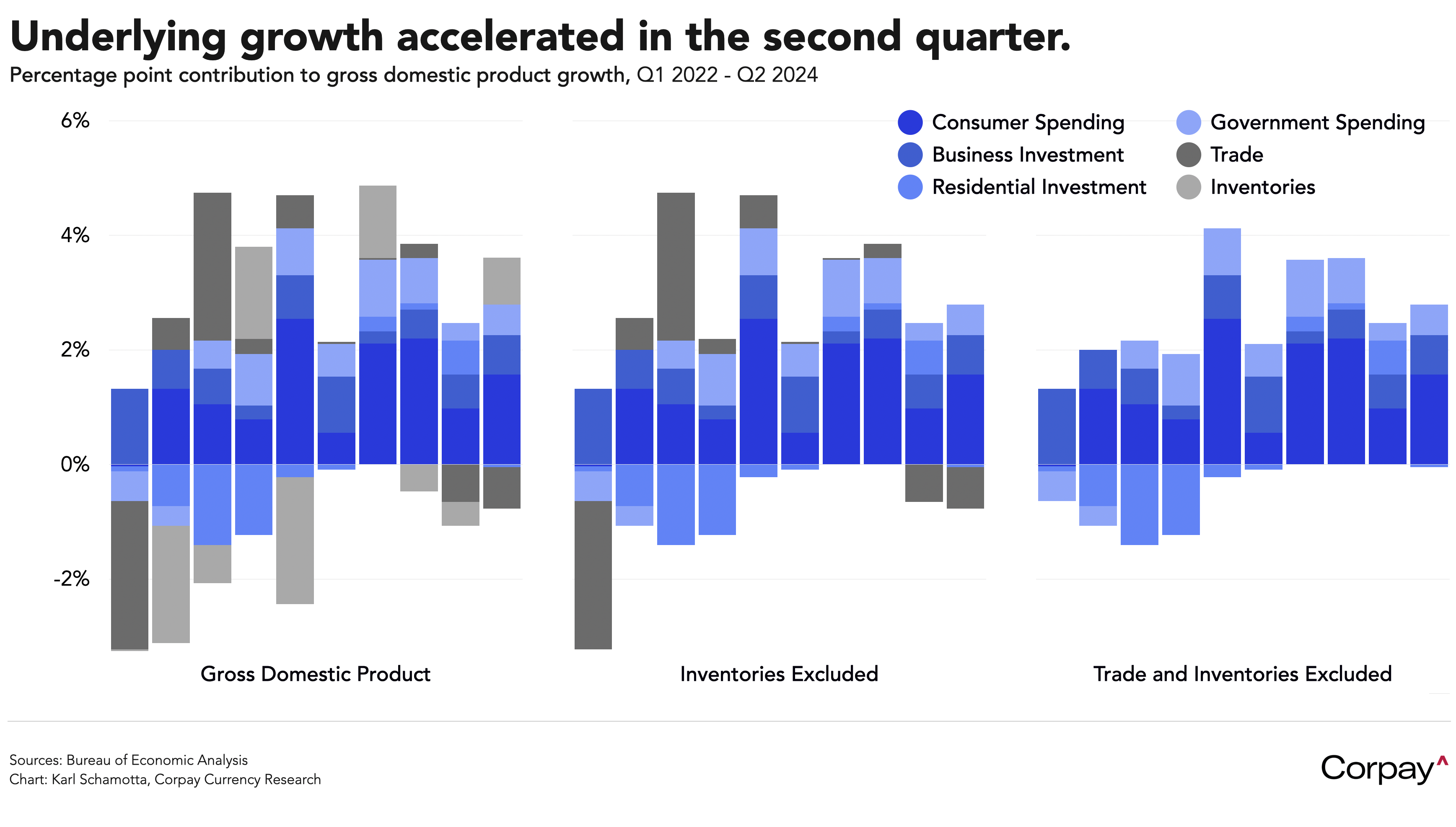 Yesterday’s second-quarter gross domestic product report showed the US economy accelerating as consumer spending increased, businesses upped investment, and inflation cooled. Output rose at an annualised 2.8 percent pace in the three months ended April, much faster than the 1.4 percent rate recorded in the first quarter, and well above the 2.1 percent consensus forecast. Final sales to private domestic purchasers — a measure used to assess underlying demand — rose 2.6 percent, and the core personal consumption expenditures index fell to 2.9 percent, down from 3.7 percent previously.