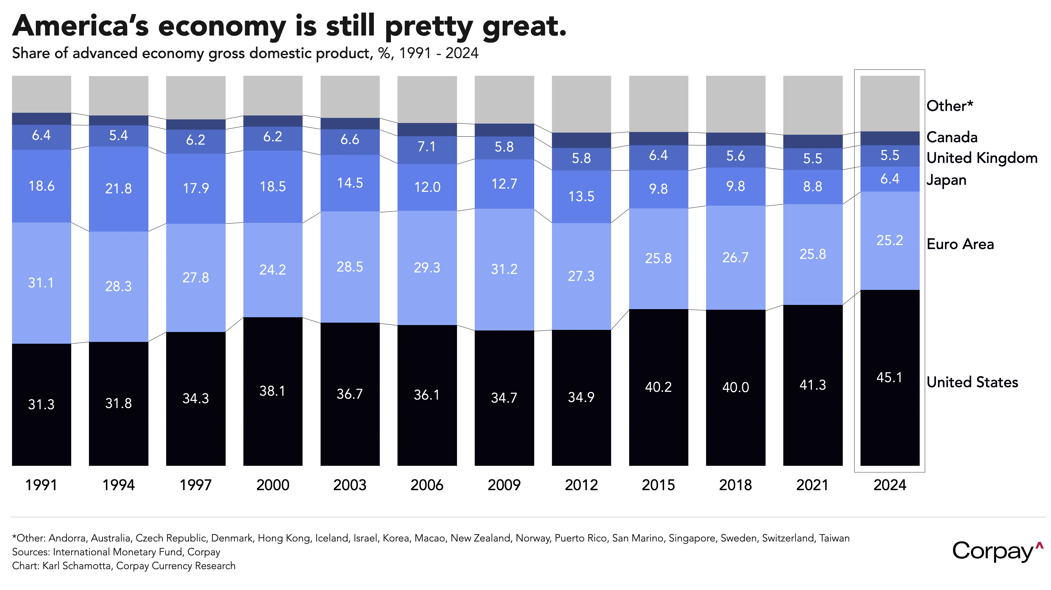 But the numbers remain consistent with an outlook in which the United States becomes an even more dominant force in the world economy. Although the US contribution to global output has stabilised over the last three decades at around 26 percent amid the rise of China and other major emerging market countries, its share of total developed-world gross domestic product has risen sharply. Even if growth slows slightly in the second half, it still looks likely to overshoot the International Monetary Fund’s latest forecasts by the end of this year, generating more than 45 percent of output in the advanced economies – and that likely understates the reality, given the scale of international profit shifting by the big pharmaceutical companies and technology behemoths. One could easily come to another conclusion after seeing the tumult in its political economy, but the US is doing pretty great.