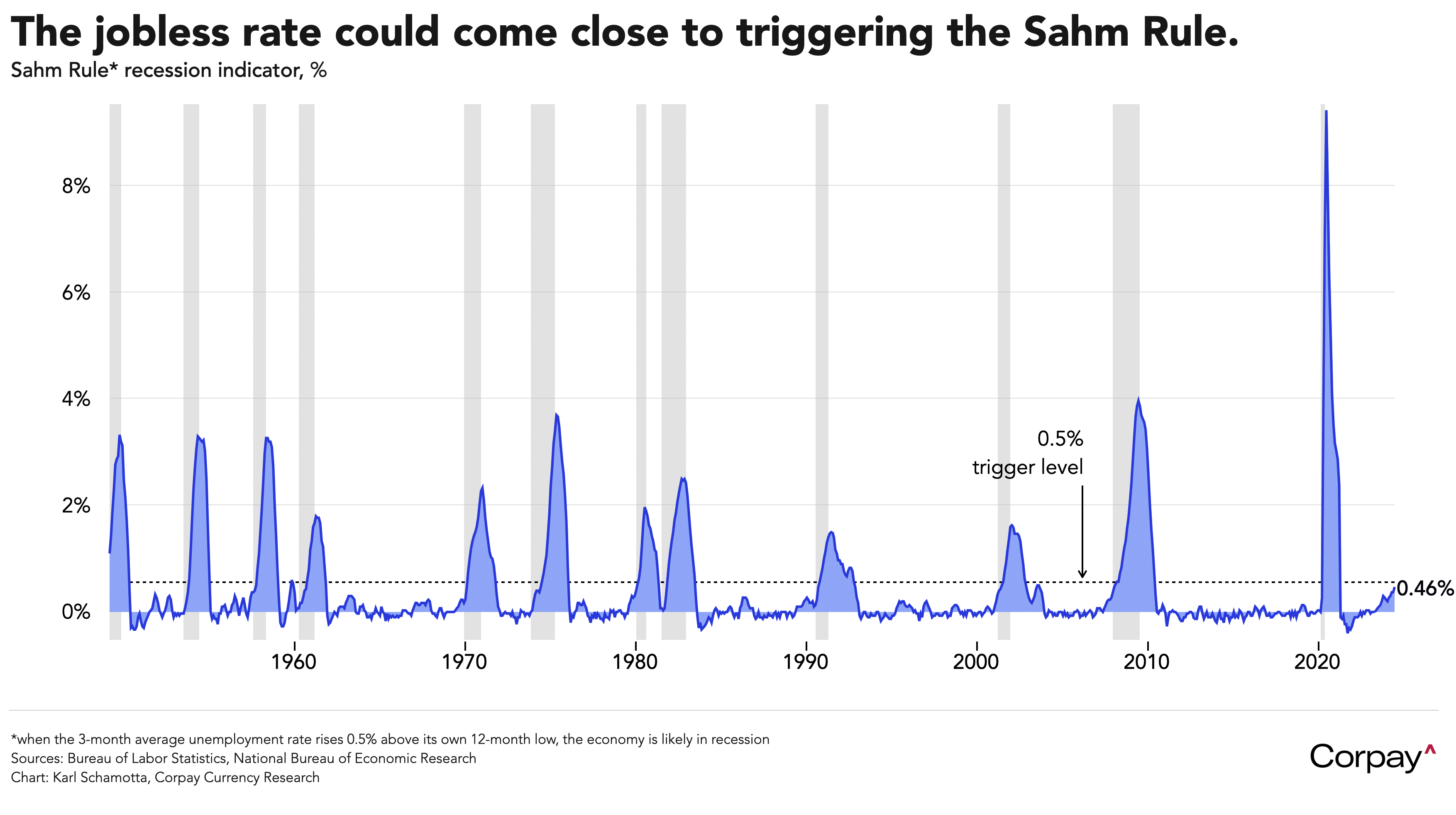 Consensus estimates suggest that Friday’s non-farm payrolls report will show another 200,000 jobs were added in July, with the unemployment rate holding at 4.1 percent for a second month. By our reckoning, this would put the three-month average of the unemployment rate 0.46 percentage points above its low in the prior 12 months, just short of the 0.50 percent needed to trigger the Sahm Rule for dating recessions. Claudia Sahm herself has argued that her eponymous indicator may not be useful in measuring the post-pandemic business cycle — given that it’s not really a business cycle — but calls for Fed easing are likely to intensify if the three-month average jobless rate continues its climb. As the saying goes, close only counts in horseshoes, hand grenades, and Fed expectations.