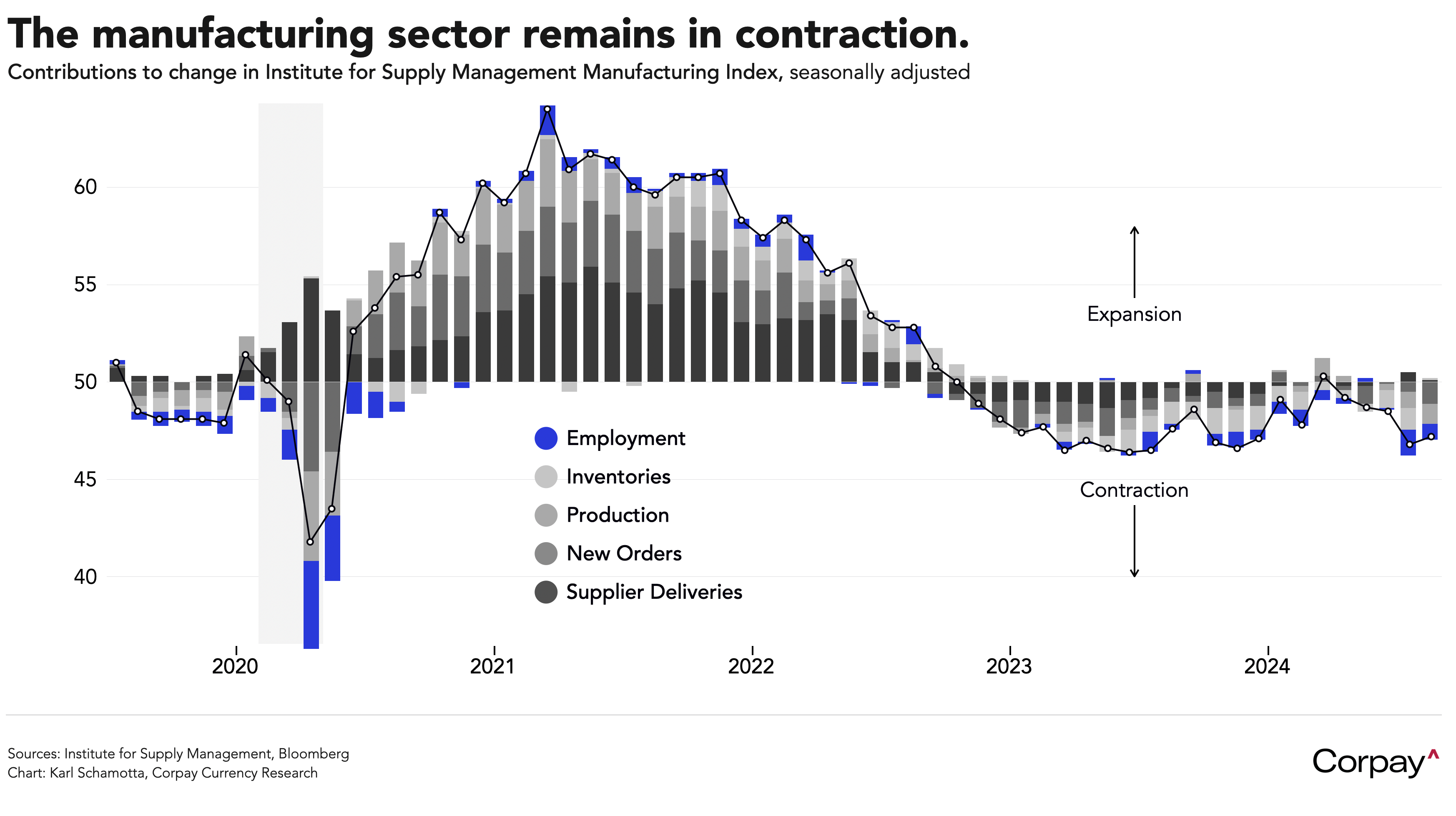 The Institute for Supply Management’s manufacturing index improved slightly in August, but remained consistent with a downturn ahead. The headline index climbed 0.4 percentage points to 47.2 – still below the 50 threshold that separates expansion from contraction – while softness in production backlogs and new orders pointed to a weaker buildup to the all-important fourth-quarter holiday season. The employment sub-index staged a modest improvement, yet remained firmly in negative territory, putting downward pressure on “whisper” estimates ahead of Friday’s payrolls report.