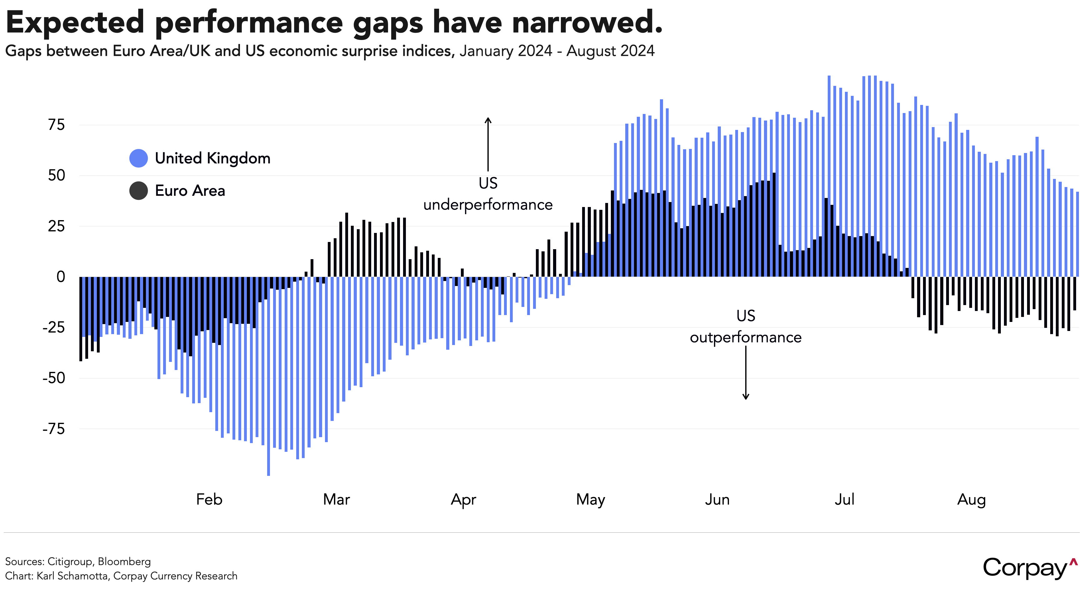 Both the pound and the euro are holding recent gains, but are struggling to move higher. Cross-Atlantic gaps between economic surprise indices – which measure the difference between consensus forecasts and realised economic data over time – have narrowed materially over the last two months, helping sap currency market momentum, and a relative stabilisation in policy expectations is limiting the extent to which rate differentials support directional position-taking. The Bank of England is seen cutting rates five times over the next year, while six moves are priced in for the European Central Bank, broadly matching the spread that existed in January.