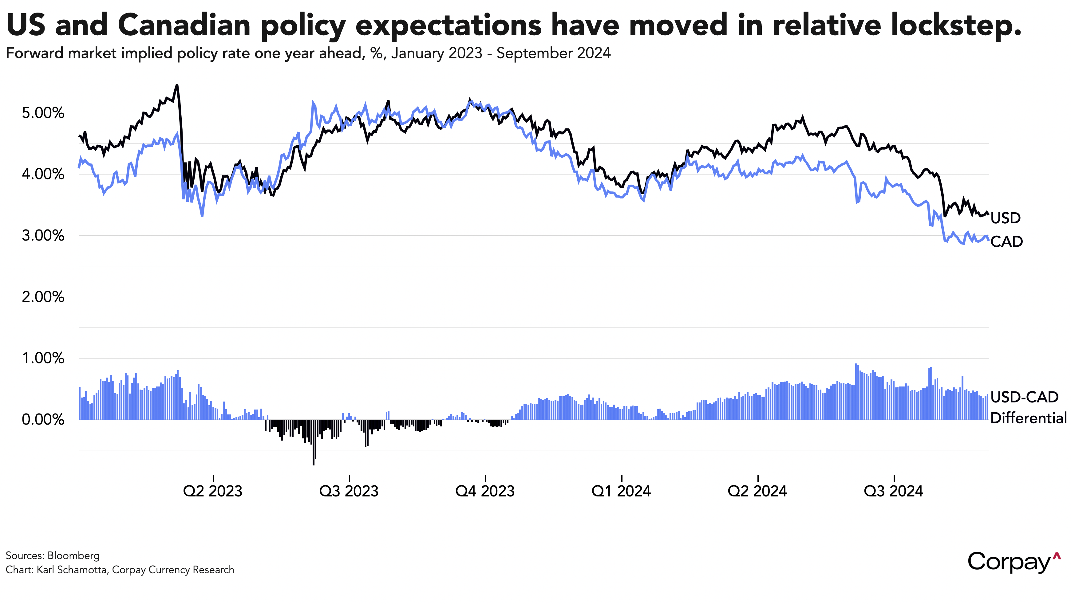 We don’t expect extreme moves in the loonie around the decision itself. Canadian policy rate expectations have ratcheted lower in the last two months, but market views on the Fed’s trajectory have moved even more aggressively, helping narrow interest differentials at the one-year horizon and beyond.