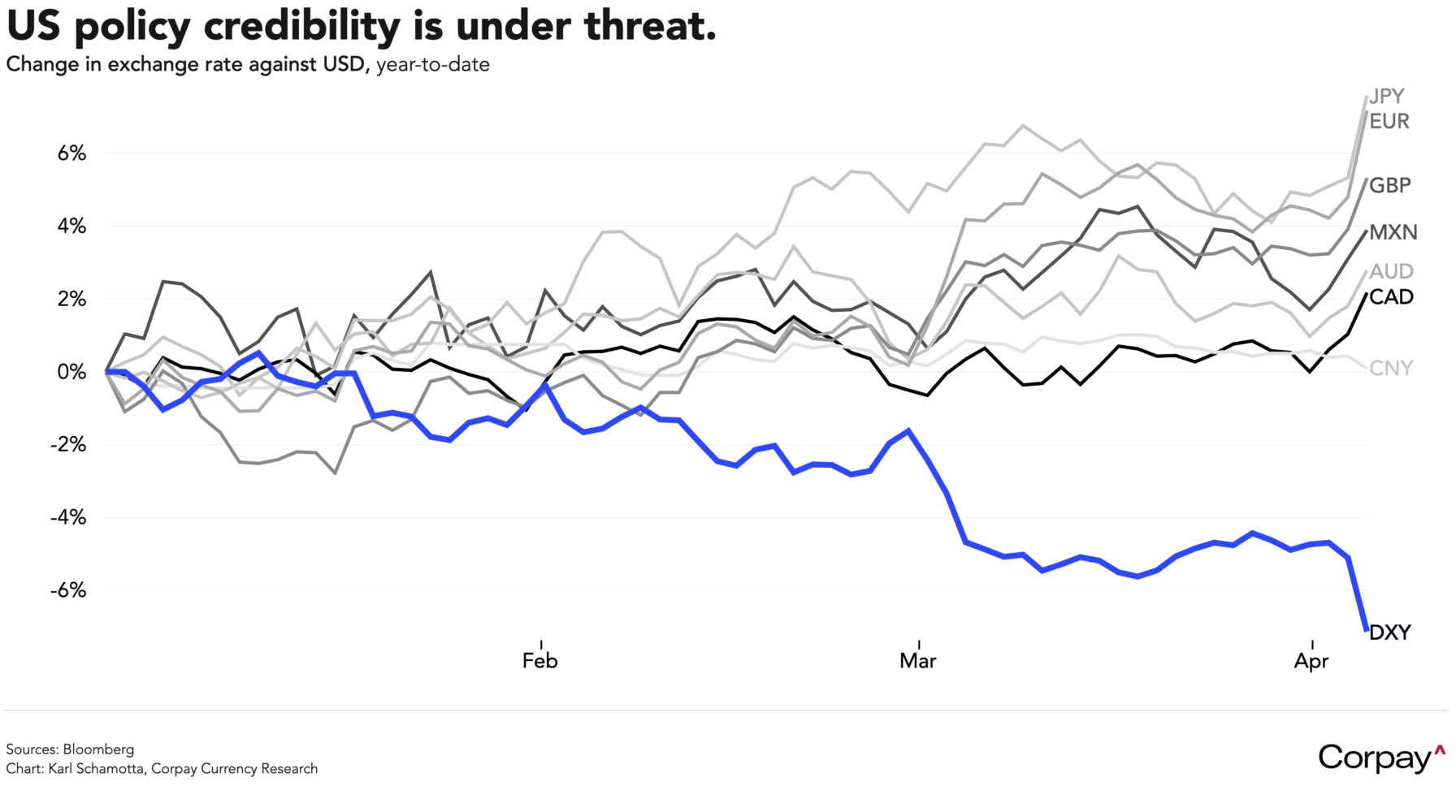 But markets expect the heaviest burden to fall on Americans themselves. By our reckoning, the announced package amounts to the biggest peacetime tax increase of any kind in modern American history—summing to roughly 2.1 percent of gross domestic product—and is easily one of the most regressive taxation measures imaginable, with the most significant costs falling on people at the bottom of the income spectrum. This is seen having tremendously-deleterious effects on consumer spending, corporate earnings, investment outcomes, and gross domestic product growth, and is contributing to the reversal in American asset prices that is weighing on the dollar’s value.