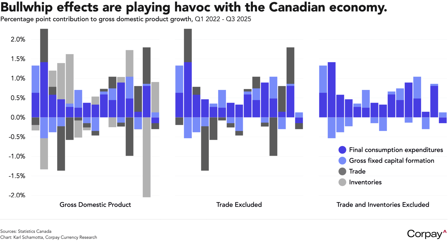 We don’t see this as a game changer for the Canadian dollar… yet. Front-end USD-CAD rate differentials narrowed materially on the print, but details below the headline level remained consistent with an economy that is struggling to generate growth outside the public sector. Net exports generated the bulk of the gain as ‘bullwhip effects’ related to tariff front-running distorted quarter-over-quarter comparisons, and the cleanest read on underlying conditions—final domestic demand—contracted, suggesting that weak investment and household spending continued to generate serious headwinds. We do expect some stabilisation in the months ahead as government spending, the lagged impact of monetary easing, and reductions in trade uncertainty help boost activity, but suspect that it will take time before sentiment begins to shift on a more sustained basis. The Canadian dollar could remain oversold for at least a few weeks yet.