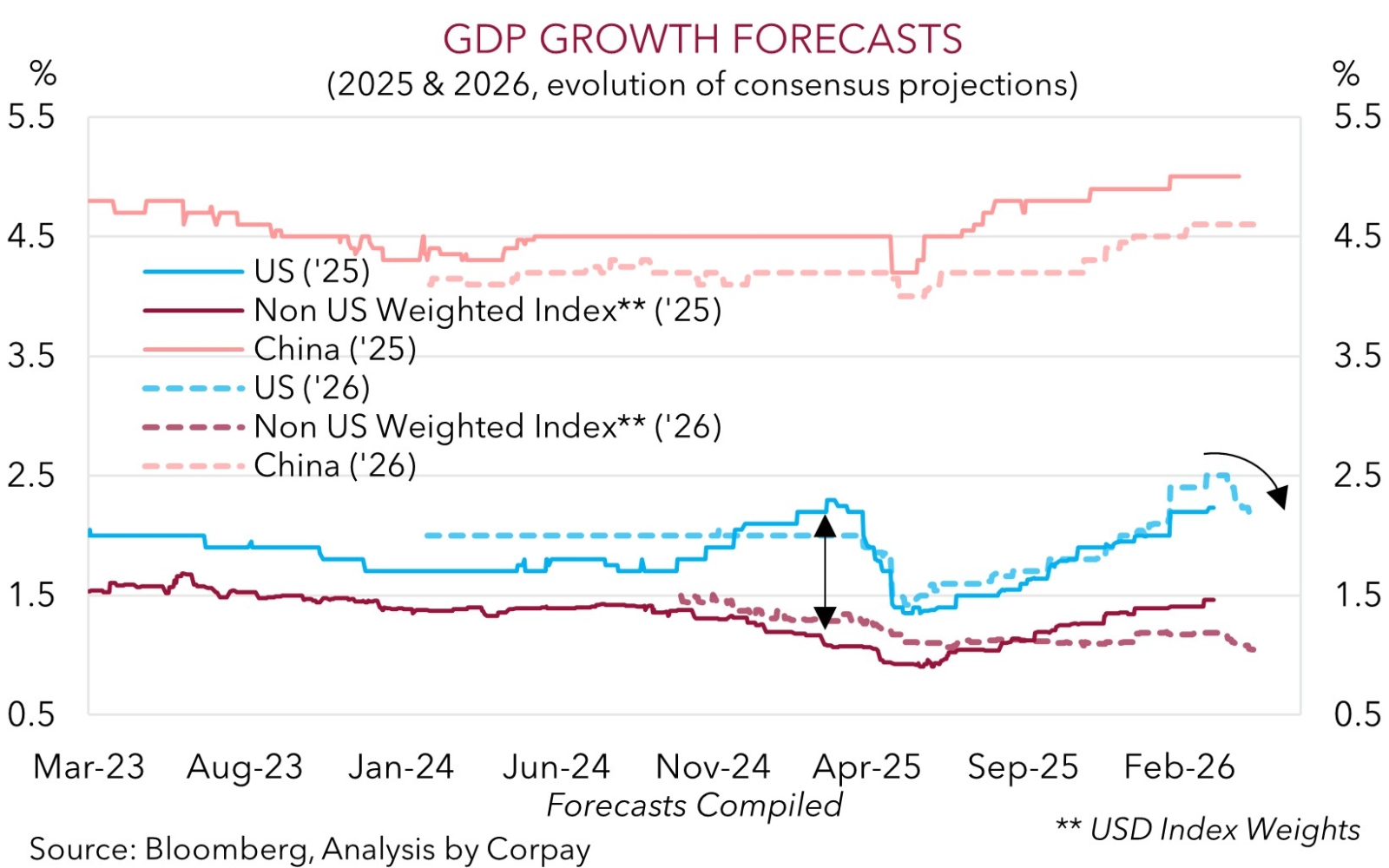 The situation in the Middle East looks set to remain in the drivers seat in the near-term. The bout of optimism about future talks may extend a bit further. However, the conflict is set to cast a long shadow over the global economy. Over coming months global growth will be weaker and inflation higher than where it was predicted at the turn of the year. In our view, the uneasy economic backdrop, coupled with a higher level of oil prices (given the US’ swing to becoming a ‘net energy exporter’) can limit how far the USD pulls back.