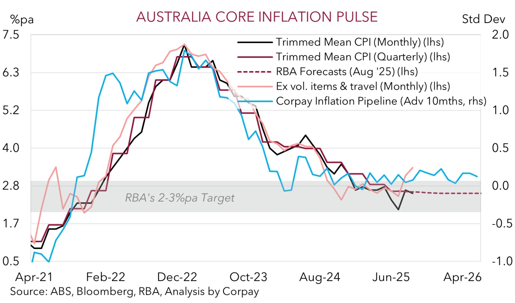 Looking ahead, Fed member Goolsbee speaks again tonight (10:20pm AEST), as does President Trump’s uber ‘dovish’ appointee Miran (10:15pm AEST). US trade data, durable goods orders (a proxy for business investment), and weekly initial jobless claims are also due (10:30pm AEST). On balance, we think softer US data could see the USD back peddle a bit in the near-term. Over the medium term (i.e. next few months) we remain of the view that the mix of slower US growth, lower US interest rates, and/or reduced inflows into US assets should see the USD’s downtrend re-assert itself.