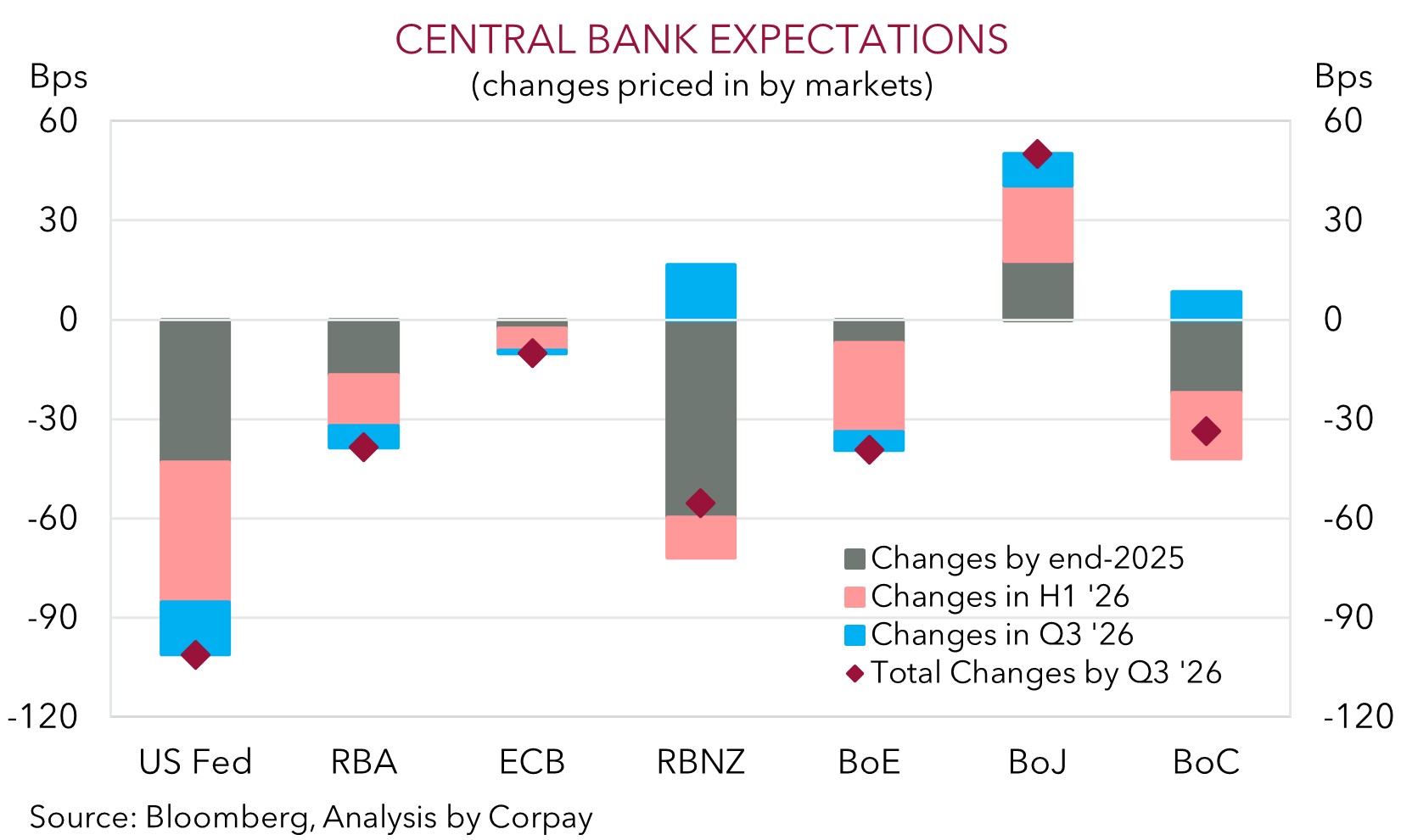 The stickiness in parts of the CPI basket, particularly around ‘services’ prices has raised doubts about further RBA rate cuts. Indeed, Q3 inflation is tracking above the RBA’s projections. At the same time activity data has been “slightly stronger” according to Governor Bullock. We wouldn’t be a surprise to see the RBA hold steady for the rest of the year as it monitors the landscape and waits for a couple of quarterly CPI prints to come through. There is a possibility no more rate cuts are delivered by the RBA, in our opinion. Markets expectations have shifted with another RBA rate cut now only fully factored in by next March. Over the medium term (i.e. next ~3-12 months) we continue to see the AUD grinding higher. We believe the AUD can be supported by a mix of a weaker USD as the US Fed lowers interest rates, signs of improvement in China’s economy as its stimulus push helps counteract tariff headwinds, firmer momentum in Australia’s economy, and ongoing cautious approach from the RBA.