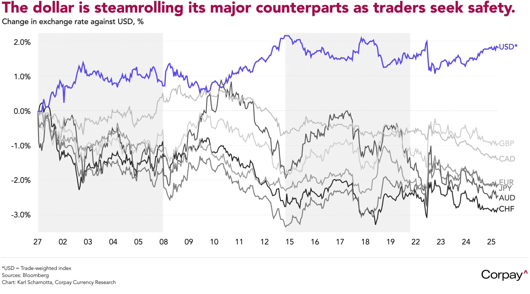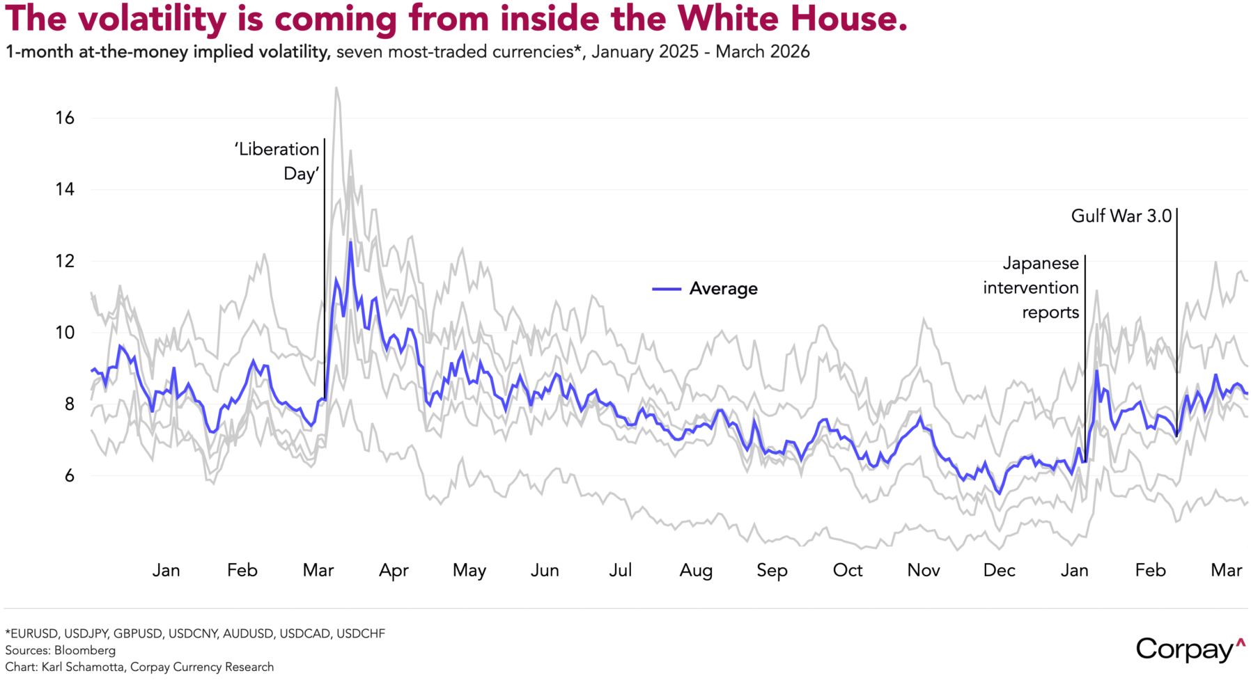 Another bout of turbulence could hit tomorrow evening, when President Trump is scheduled to speak at the Future Investment Initiative Priority Summit in Miami at 5:30 pm, giving him an opportunity to outline next steps in the war with Iran. At this juncture, it is impossible to know what he will say, but it is worth noting that every major volatility shock in currency markets over the past 15 months has originated from a member of the Trump administration, and most have been timed to land when North American markets are closed.