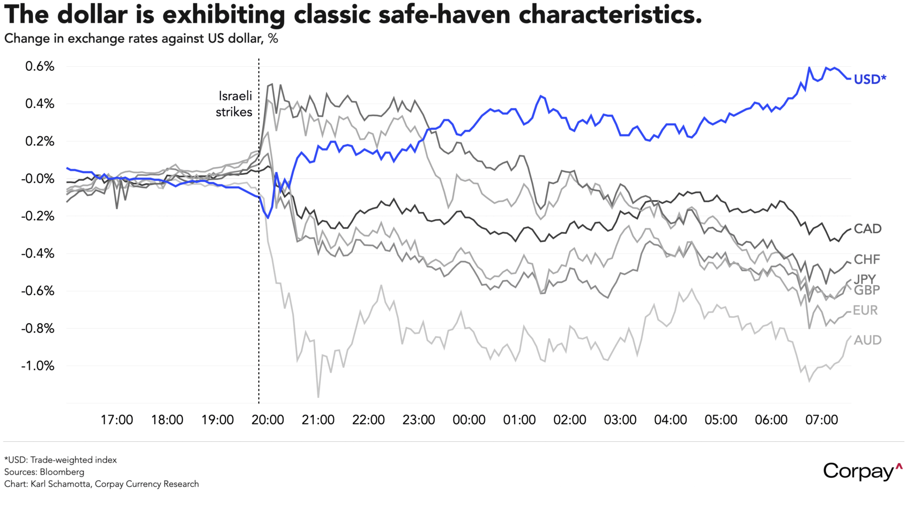 Foreign exchange moves have been relatively modest in scale. Over the last decade, dozens of potentially dangerous tit-for-tat cycles in the Middle East have been de-escalated within days, conditioning currency traders to avoid taking big directional positions in response to alarming headlines out of the region. We suspect something similar will play out this time: Tehran remains deeply reliant on oil exports for foreign exchange, and aware of the damage that could be inflicted by the US, which maintains overwhelming military superiority in the region. US Secretary of State Marco Rubio last night said, “Israel took unilateral action against Iran. We are not involved in strikes against Iran,” before warning “Let me be clear: Iran should not target US interests or personnel”. But risks also can’t be ignored, with the extent of Israel’s assault raising the likelihood of a wider escalation.