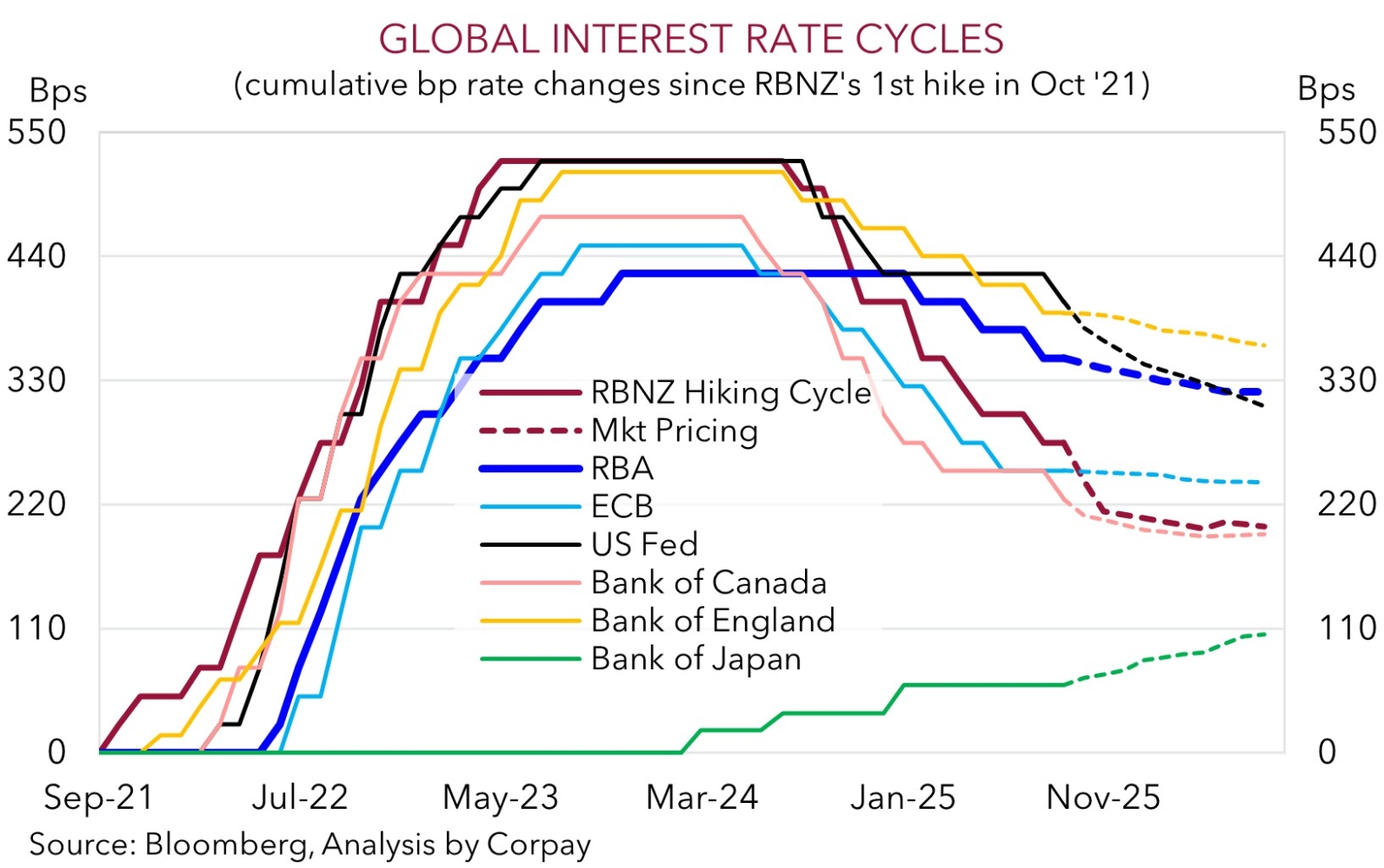 In Australia this week RBA Governor Bullock testifies to the parliamentary committee (Friday). We would expect the Governor to hold the recent line that policy decisions will be taken meeting by meeting. Further RBA rate cuts are far from guaranteed. From our perspective the stickiness in Australian inflation, resilient jobs market, and pick up in economic momentum suggests the odds of another RBA rate cut this year are low. The diverging policy trends between the RBA and other central banks such as the US Fed, coupled with an improvement in China’s growth pulse, should, in our opinion, support the AUD into year-end.