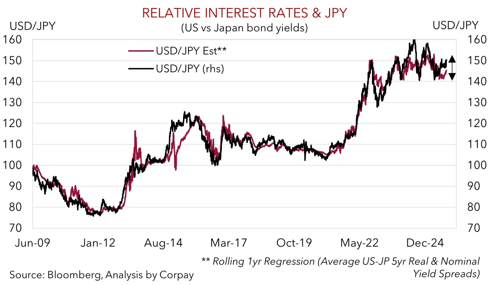 We judge the JPY may have moved too far too quickly with the knee-jerk reaction during yesterday’s early Asian trade (which typically has lower liquidity) amplifying the FX swings. Underlying inflation trends in Japan are quite different to what they were in the past and this may mean the BoJ’s hands are tied and/or the prospect of more aggressive fiscal measures being deployed aren’t as elevated as some participants think. Indeed, as shown in the chart below, our interest rate based model suggests USD/JPY should be tracking closer to ~145 not ~150 even after accounting for the adjustment in relative bond yields. A drift lower in USD/JPY towards levels implied by fundamentals could flow through to the USD given it is the second most traded currency pair. This would align with our broader view that the challenging growth backdrop in the US and outlook for more US Fed interest rate cuts over coming months should exert downward pressure on the USD over the period ahead.