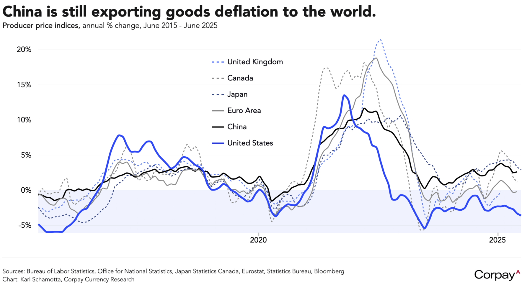 The dollar is down incrementally, yields are very modestly lower across the curve, and North American equity markets are gaining at the open as investors turn slightly more optimistic on the likelihood of an imminent resumption in the Federal Reserve’s easing cycle. June producer prices and the closely-watched Beige Book survey, both out tomorrow, along with Thursday’s retail sales number, could force a recalibration in expectations, but for now, the jury is still out on whether tariffs will ultimately force the central bank to postpone its rate cuts for longer. We expect July and August data to play a more decisive role, and think policymakers will continue repeating their wait-and-see message for now.