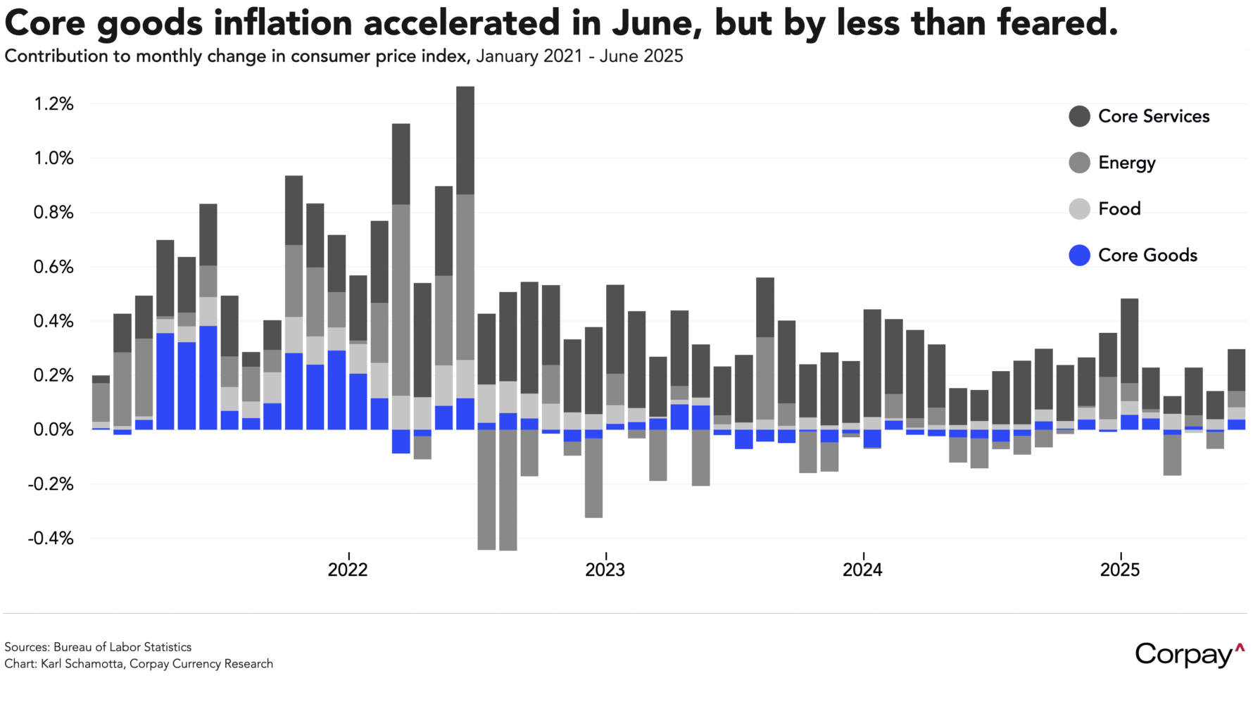 US inflation printed below expectations for a fifth consecutive month in June as tariff-led price increases in core goods categories were offset by softness in the services sector and in automobile costs. According to data published by the Bureau of Labor Statistics this morning, the core consumer price index – with highly-volatile food and energy prices excluded – rose 2.9 percent in June from the same period last year, up 0.3 percent on a month-over-month basis, accelerating from the prior month’s 0.1-percent pace, but undershooting consensus estimates among economists polled by the major data providers ahead of the release. On a headline all-items basis, prices climbed 2.6 percent year-over-year, speeding up from the 2.4 percent pace set in May, and were up 0.3 percent from a month-over-month standpoint.