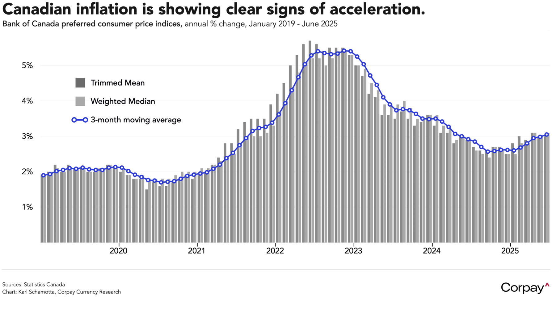 Here in Canada, inflation pressures intensified more than expected last month, further lowering the likelihood of a rate cut at next week’s Bank of Canada meeting. Data released by Statistics Canada this morning showed an average of the two core price measures now preferred by the Bank of Canada (trim and median) accelerating to 3.05 percent in June, faster than the 3 percent previously recorded, while the headline consumer price index climbed 1.9 percent on a year-over-year basis in June, up from 1.7 percent in May. A “diffusion” index, which tracks the number of price components rising by 3 percent or more, widened to 39.1 percent from 37.3 percent previously.