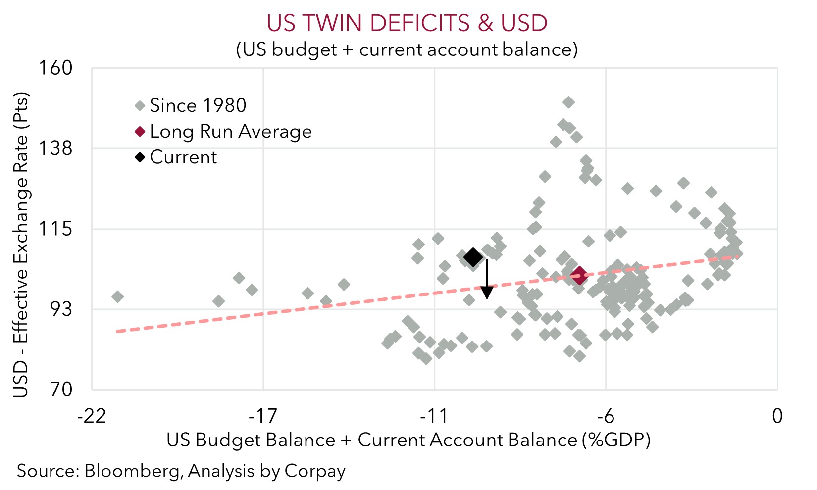 The global macro calendar picks up over the rest of the week. Tonight, weekly US initial jobless claims are due (12:30am AEDT), as are the October/November PCE deflator prints (2am AEDT). Signs of firmer US spending and/or sticky core inflation pressures may, in our opinion, give the USD some renewed support. However, we don’t think turnarounds in the USD should be overly large/long lasting. The overvalued USD is facing longer-term structural headwinds such as the US’ sizeable ‘twin deficits’ (see chart below).
