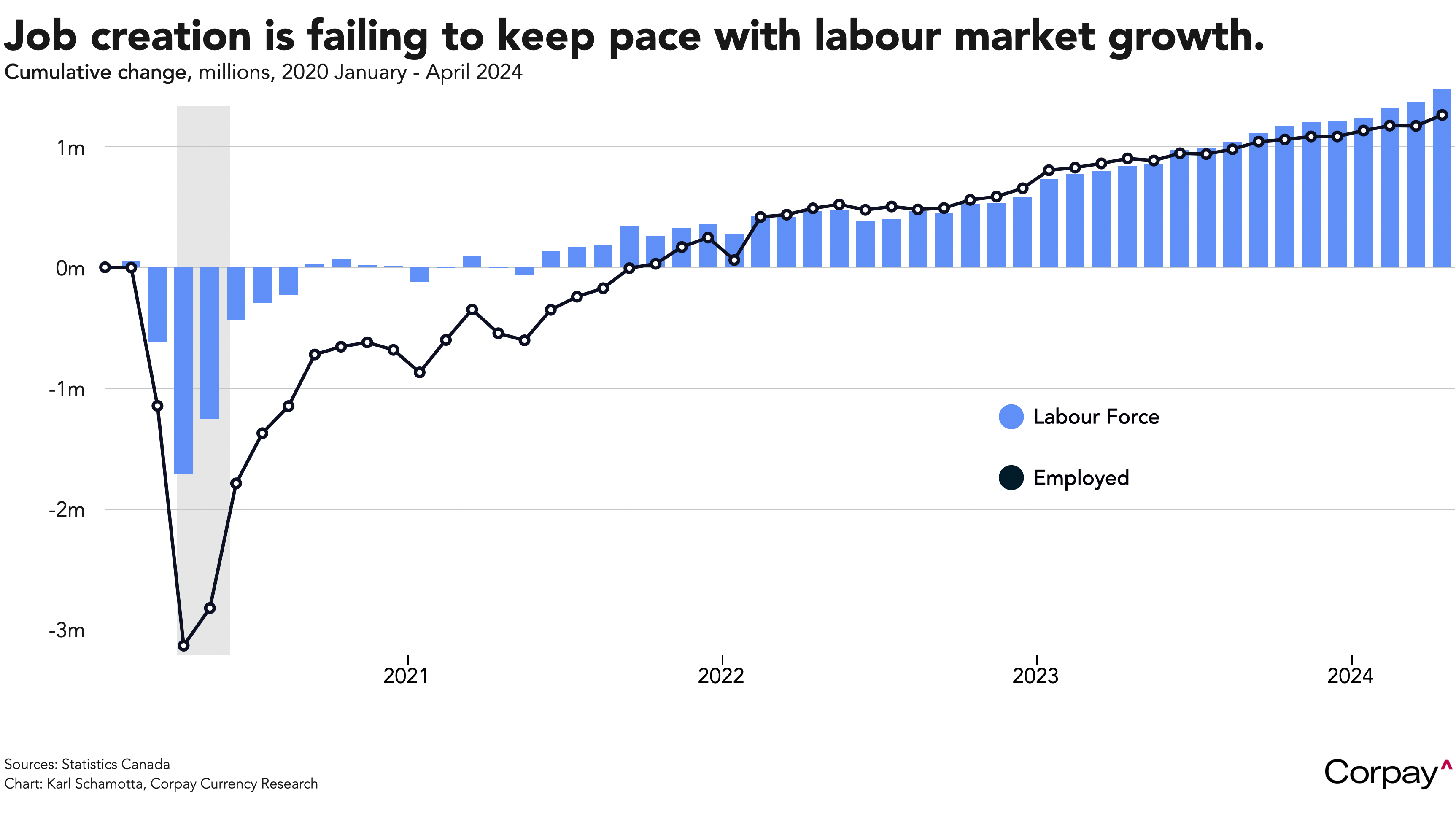 The Canadian economy generated more jobs than anticipated in April, helping reduce market expectations for an imminent pivot toward easier monetary policy from the Bank of Canada. 90,000 new positions were added in the month and the unemployment rate held at 6.1 percent in March. Consensus estimates had pointed to 20,000 new hires, with elevated population growth and still-high participation rates pushing unemployment to 6.2 percent.