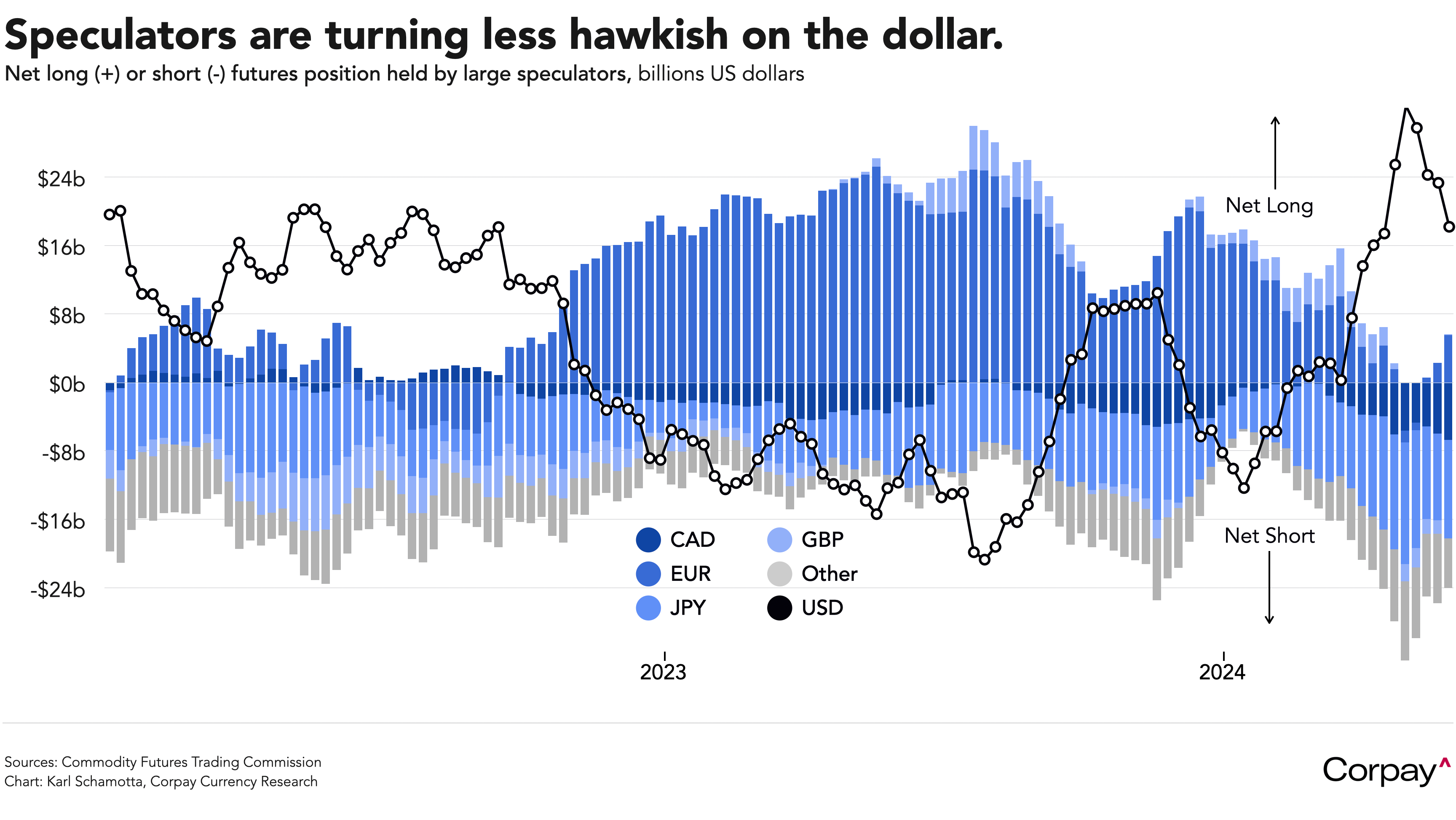 The European Central Bank is widely expected to deliver a rate cut at next week’s meeting, but we suspect policymakers will pair the move with explicit forward guidance warning markets against expecting additional cuts to follow at subsequent meetings. The Bank of England is seen following in August, with a similar template coming into play. Speculators piled into long positions on both currencies and reduced bets on the dollar for a fourth week last week as incoming data pointed to a narrowing in cross-Atlantic growth differentials.