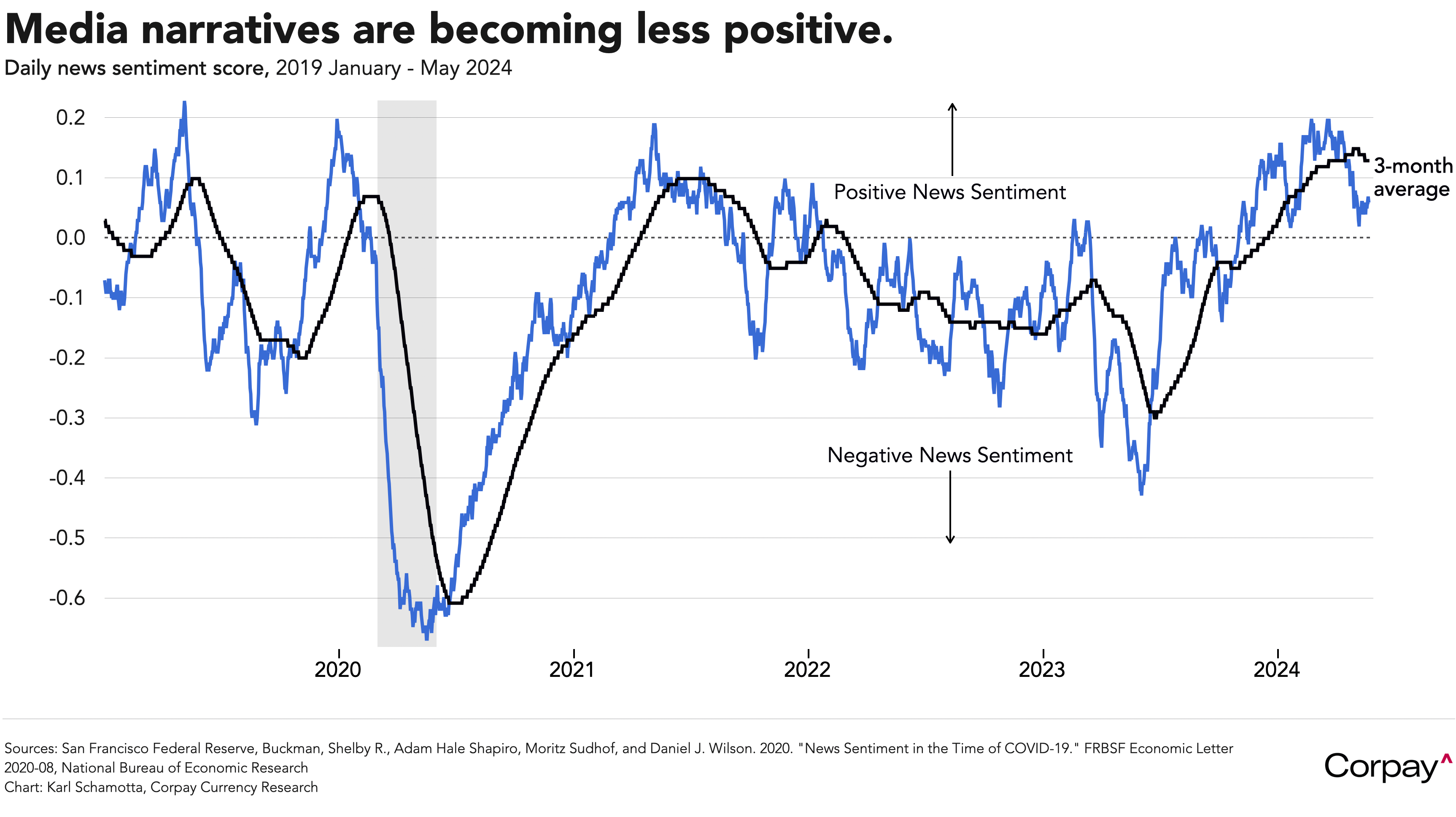 A holiday-shortened week will get off to a slow start with this morning’s Conference Board US consumer confidence survey looming as the only data release with obvious market-moving potential before the pace begins to pick up again on Thursday. Echoing the University of Michigan’s measure, households likely turned more pessimistic in May as labour markets softened, prices remained high, and last autumn’s improvement in economic newsflow began to lose momentum. The San Francisco Fed’s Daily News Sentiment Index – which measures the economic sentiments expressed in 24 major US newspapers – turned less positive in early April.