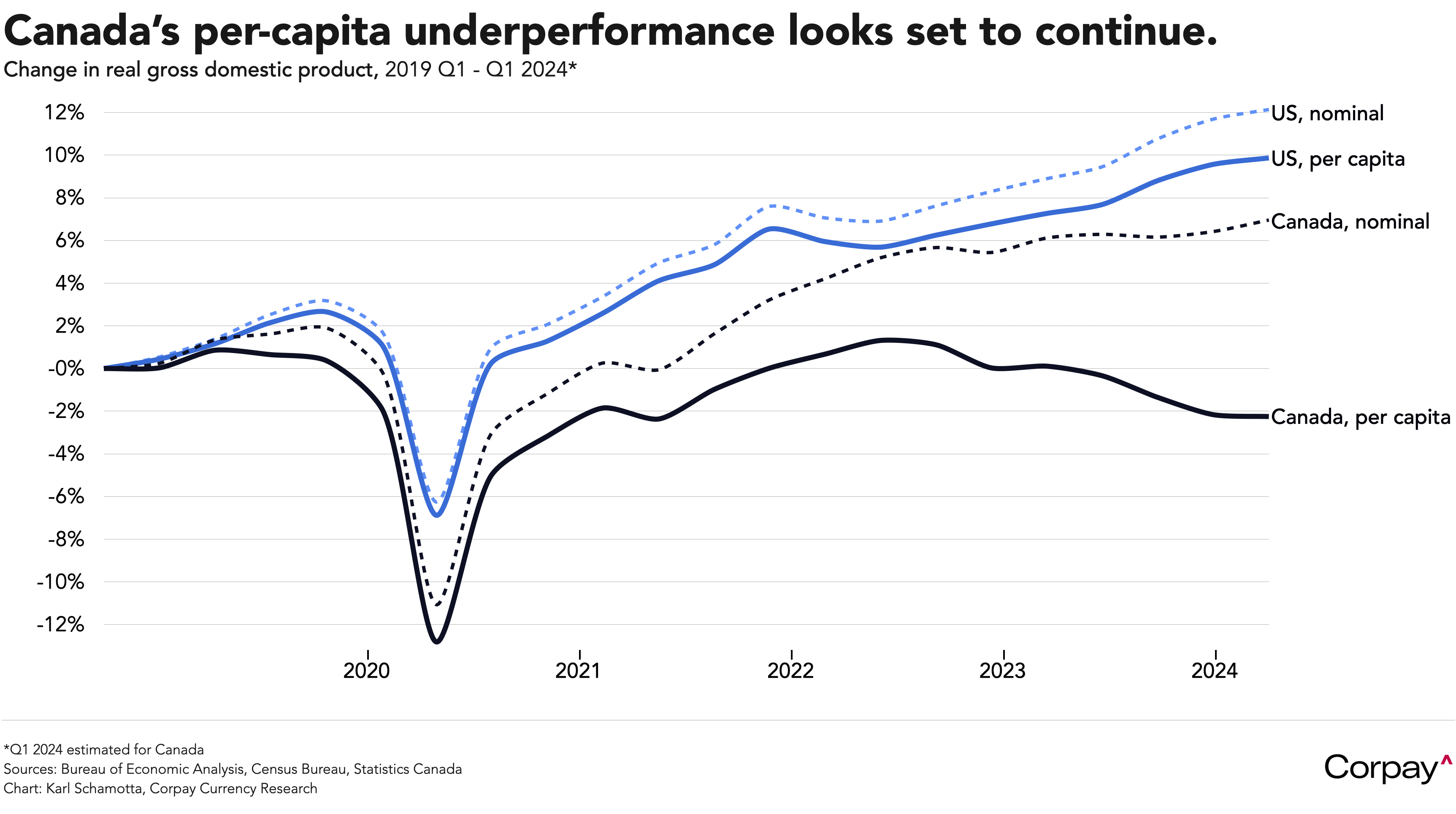 Canada’s gross domestic product report – also out on Friday – is expected to show the economy expanding 2.2 percent in the first quarter, up from 1 percent in the last three months of 2023. With the population surging, output likely contracted for a seventh consecutive quarter on a per-capita basis, further widening Canada’s performance gap relative to the United States.