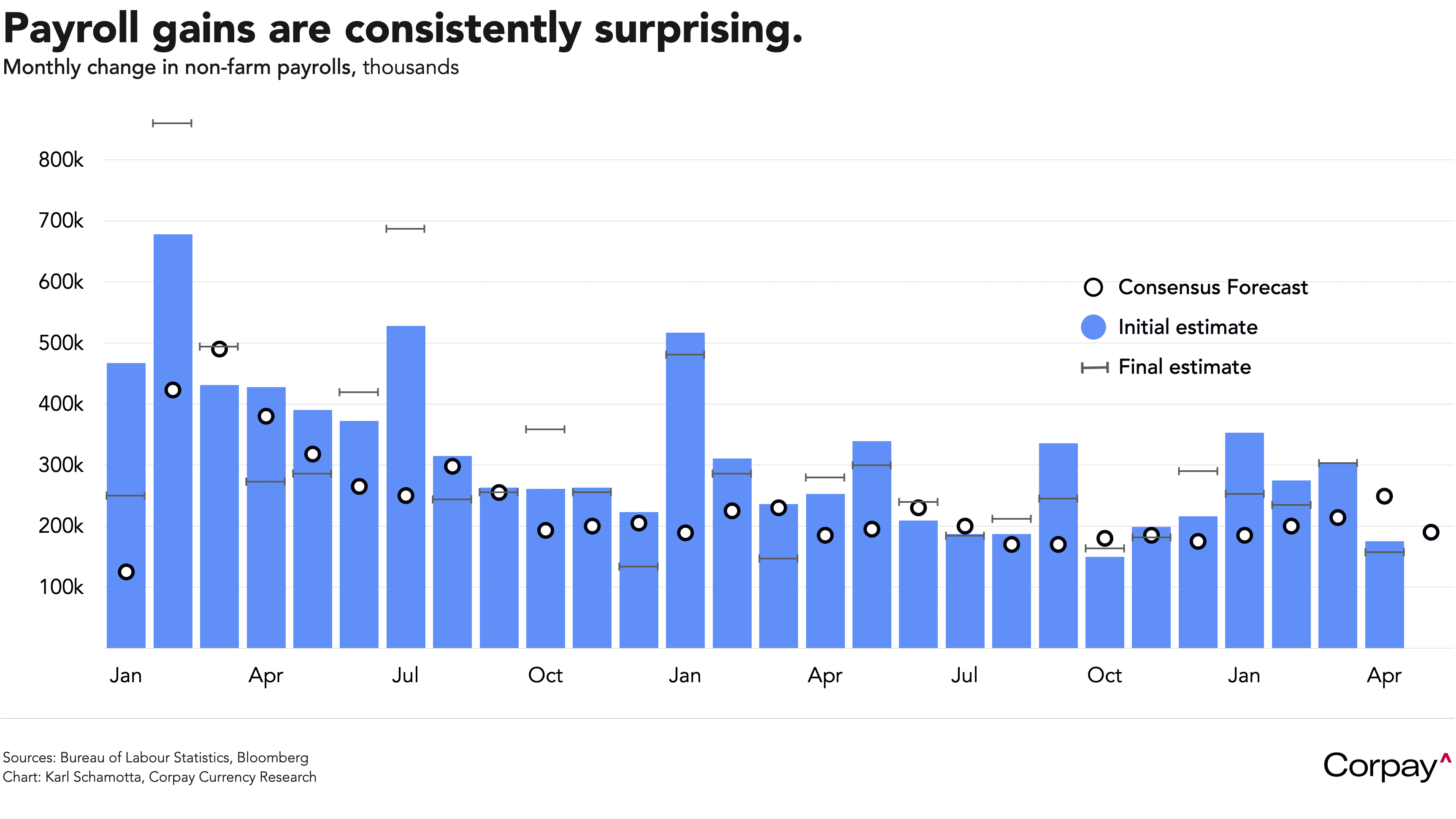 But it would be surprising if the payrolls number wasn’t surprising. The initial estimate provided by the Bureau of Labor Statistics has repeatedly missed forecasts – on both sides – through the post-pandemic period, and there’s little to suggest that this month’s report will break the pattern. Market turbulence is fairly likely.