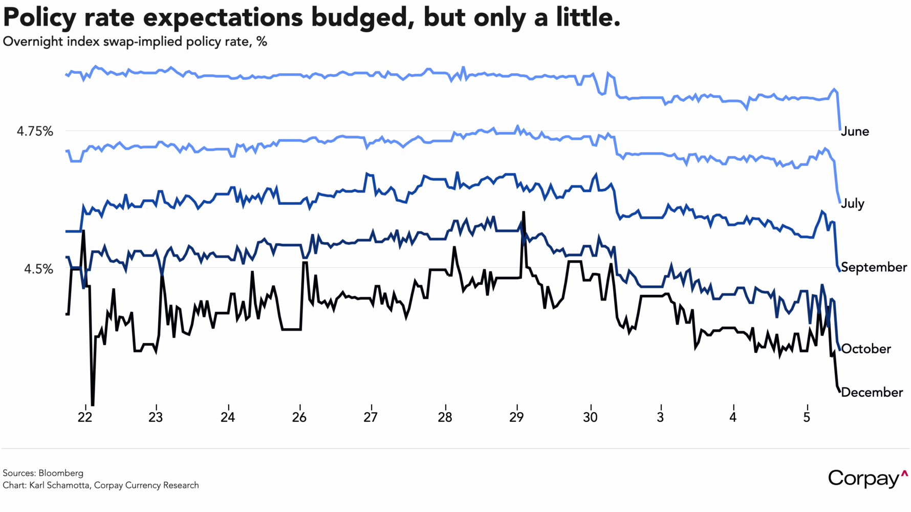 Yesterday’s rate cut from the Bank of Canada had a relatively muted impact on markets. The Canadian dollar sold off almost 40 basis points in the moments after the decision was released, but fully reversed its losses over the next hour and is now trading near pre-decision levels. Swap markets saw modest moves as investors lifted bets on the next rate cut coming as soon as July – but the total number priced in for 2024 remained fairly static and US-Canada yield differentials held relatively firm.